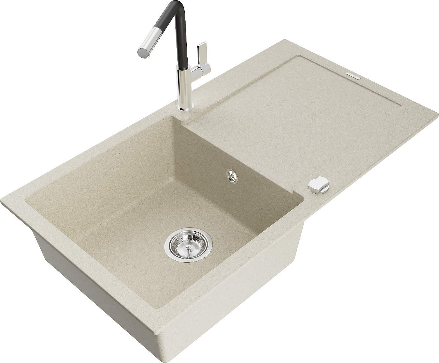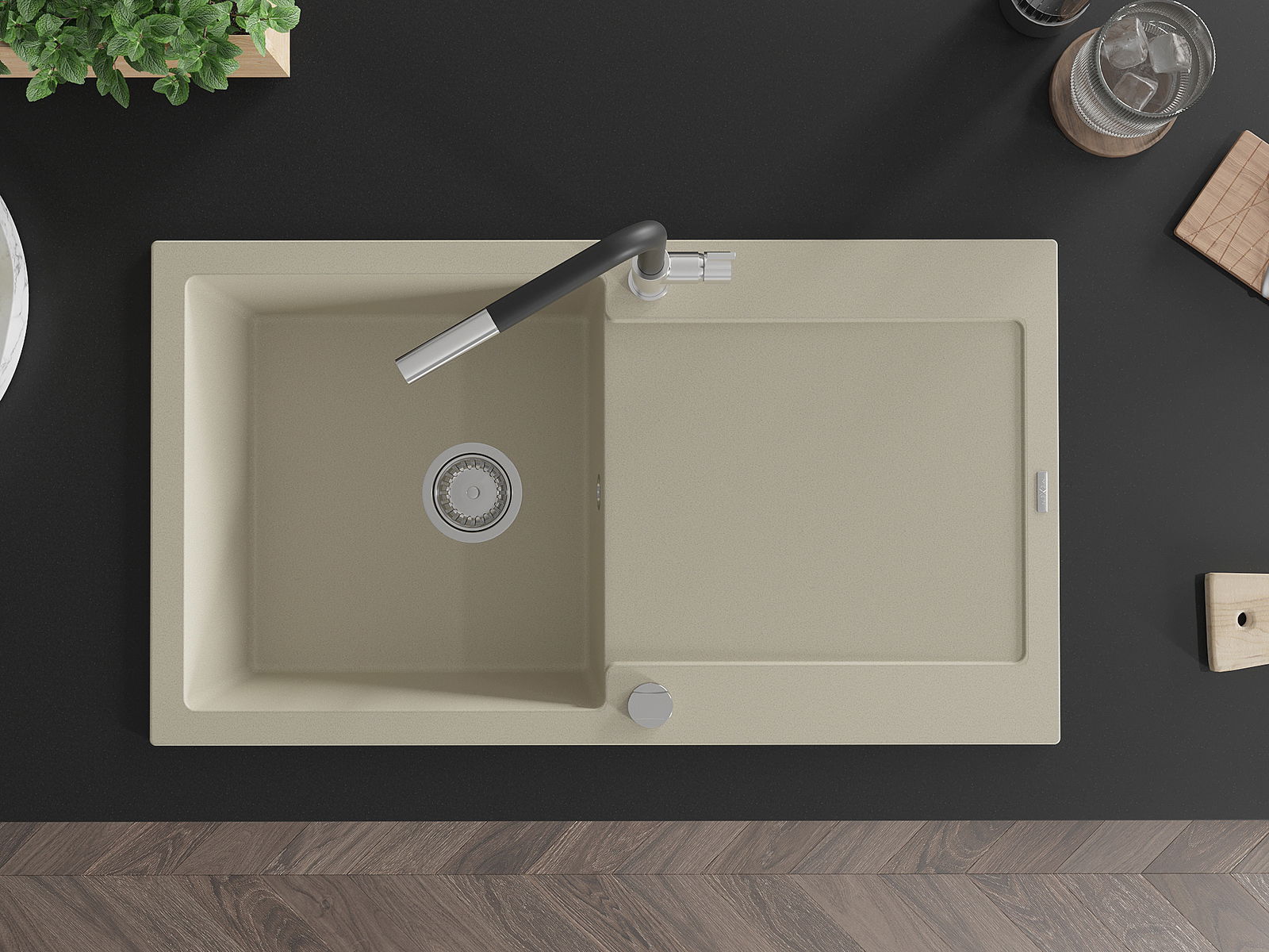 Mexen Leo chiuvetă de granit cu o singură cuvă și scurgător și baterie de bucătărie Flora, bej - 6501-69-670401-07