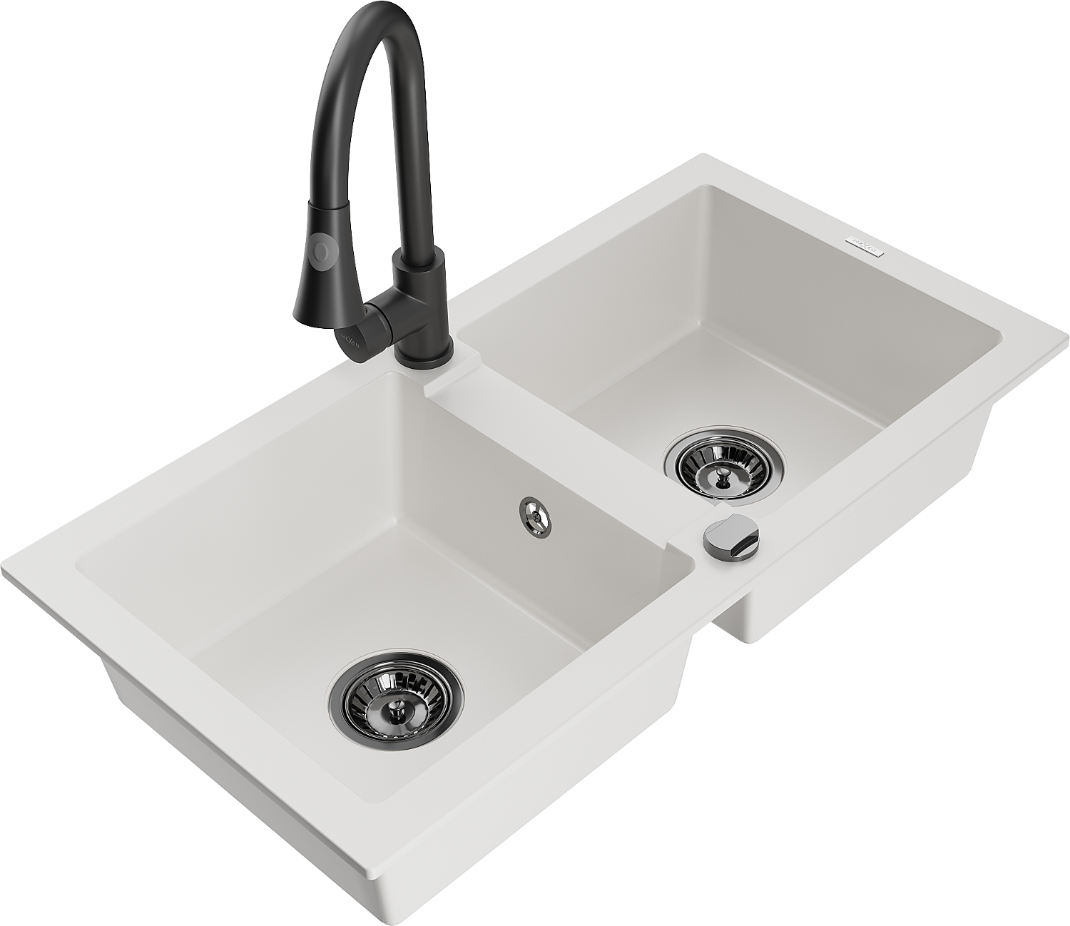 Mexen Mario chiuvetă de bucătărie din granit cu 2 cuve și robinet de bucătărie Elia, alb - 6504-20-670101-70