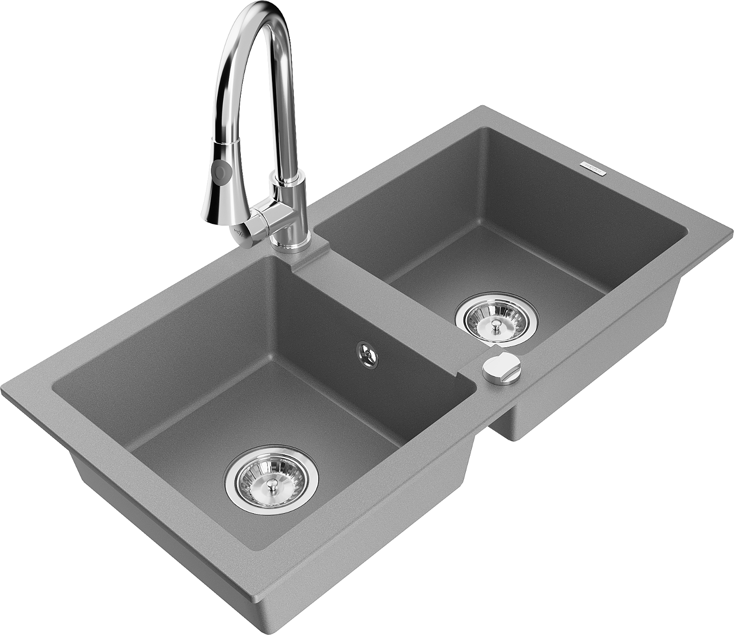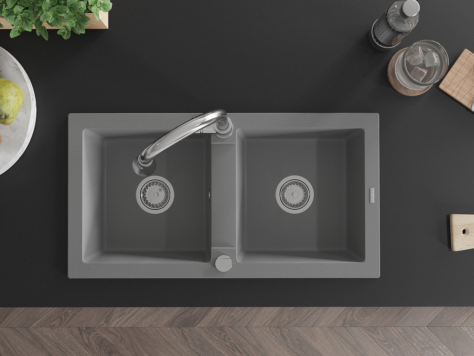 Mexen Mario chiuvetă de bucătărie din granit cu 2 compartimente și baterie Elia, gri - 6504-71-670101-00