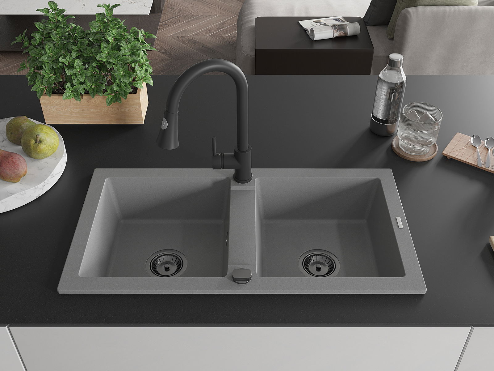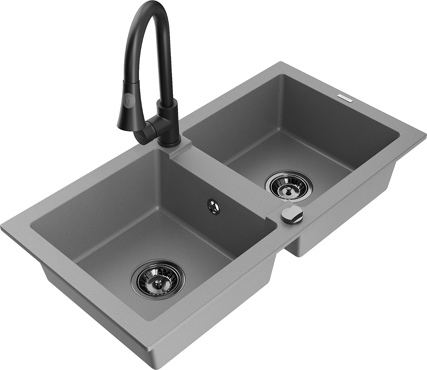 Mexen Mario chiuvetă granit dublă cu baterie de bucătărie Elia, gri - 6504-71-670101-70-B