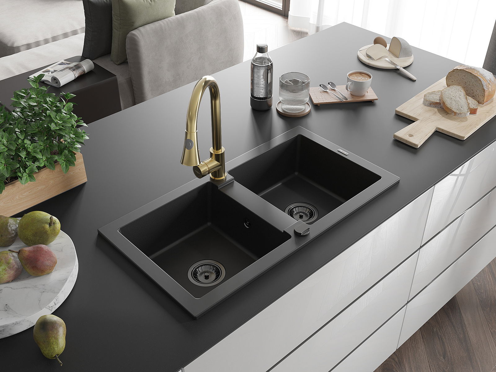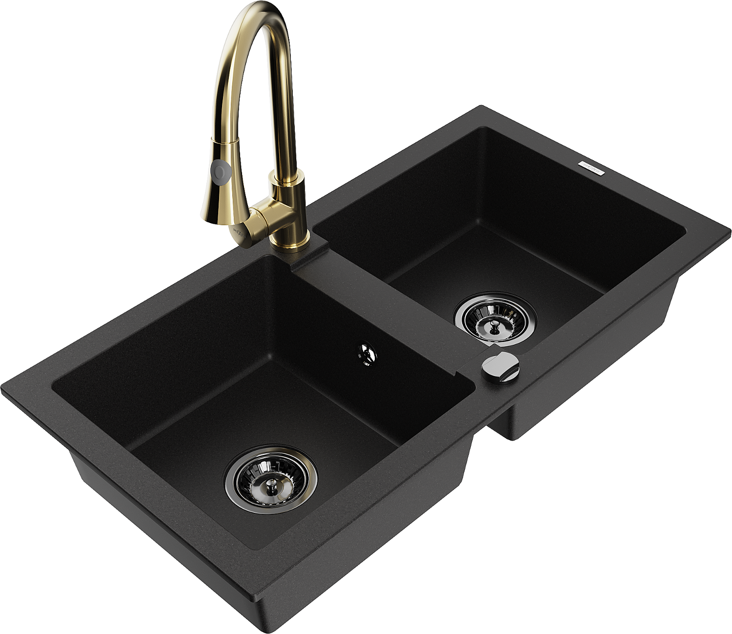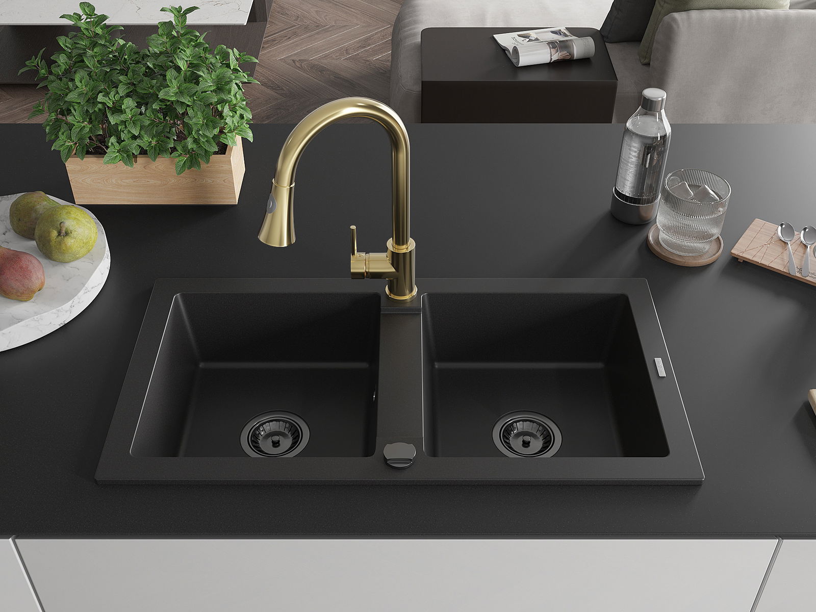 Mexen Mario chiuvetă de bucătărie din granit cu 2 compartimente și baterie de bucătărie Elia, negru - 6504-77-670101-50-B