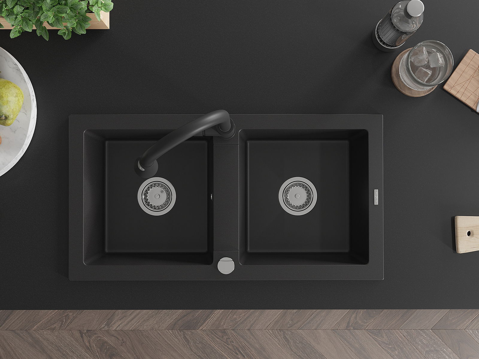 Mexen Mario chiuvetă de bucătărie din granit cu 2 compartimente și baterie de bucătărie Elia, negru - 6504-77-670101-70