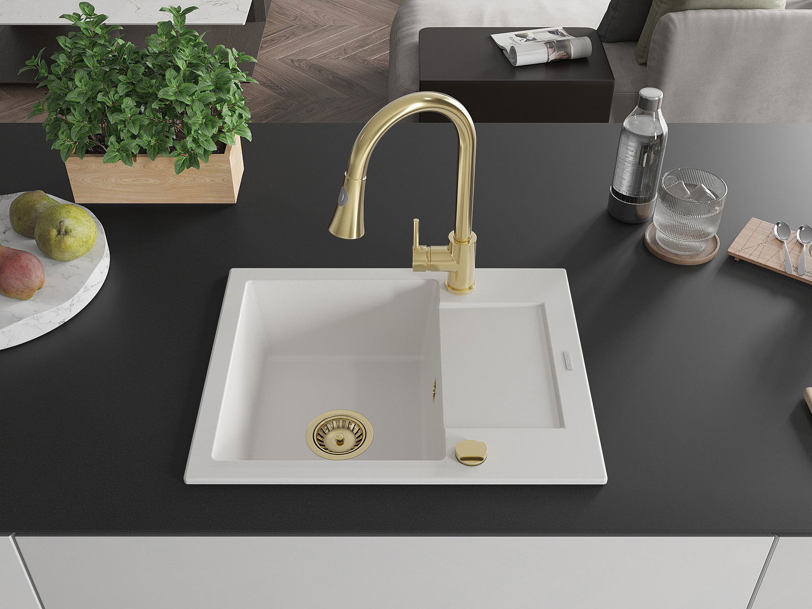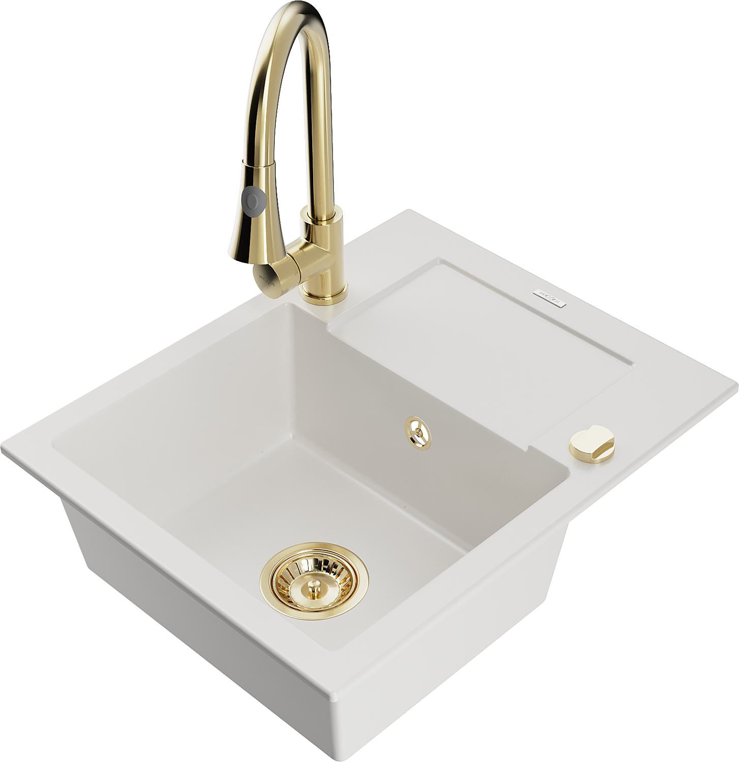 Mexen Enzo chiuvetă de bucătărie granit cu 1 compartiment cu picurător și baterie de bucătărie Elia, alb - 6506-20-670101-50