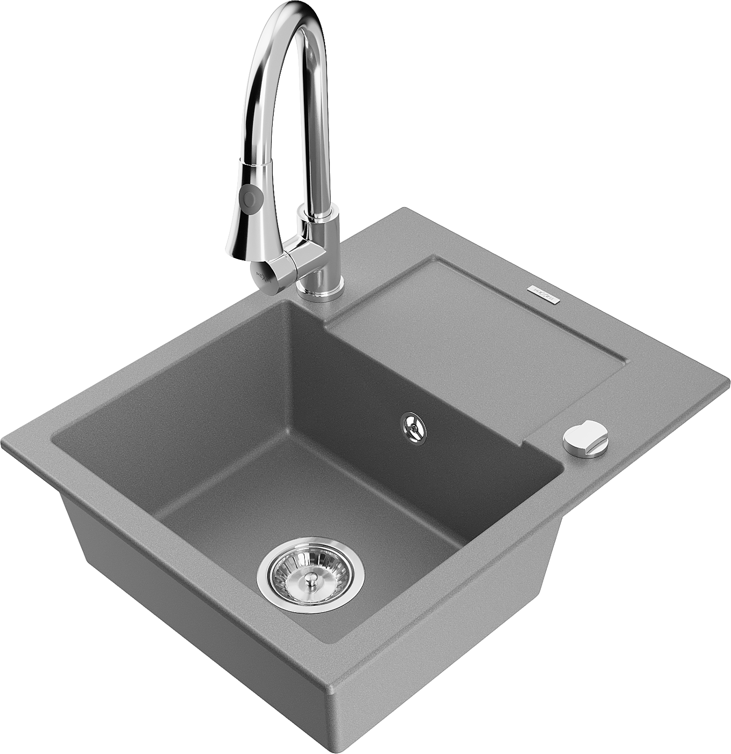 Mexen Enzo chiuvetă de granit cu 1 cameră și scurgător și baterie de bucătărie Elia, gri - 6506-71-670101-00