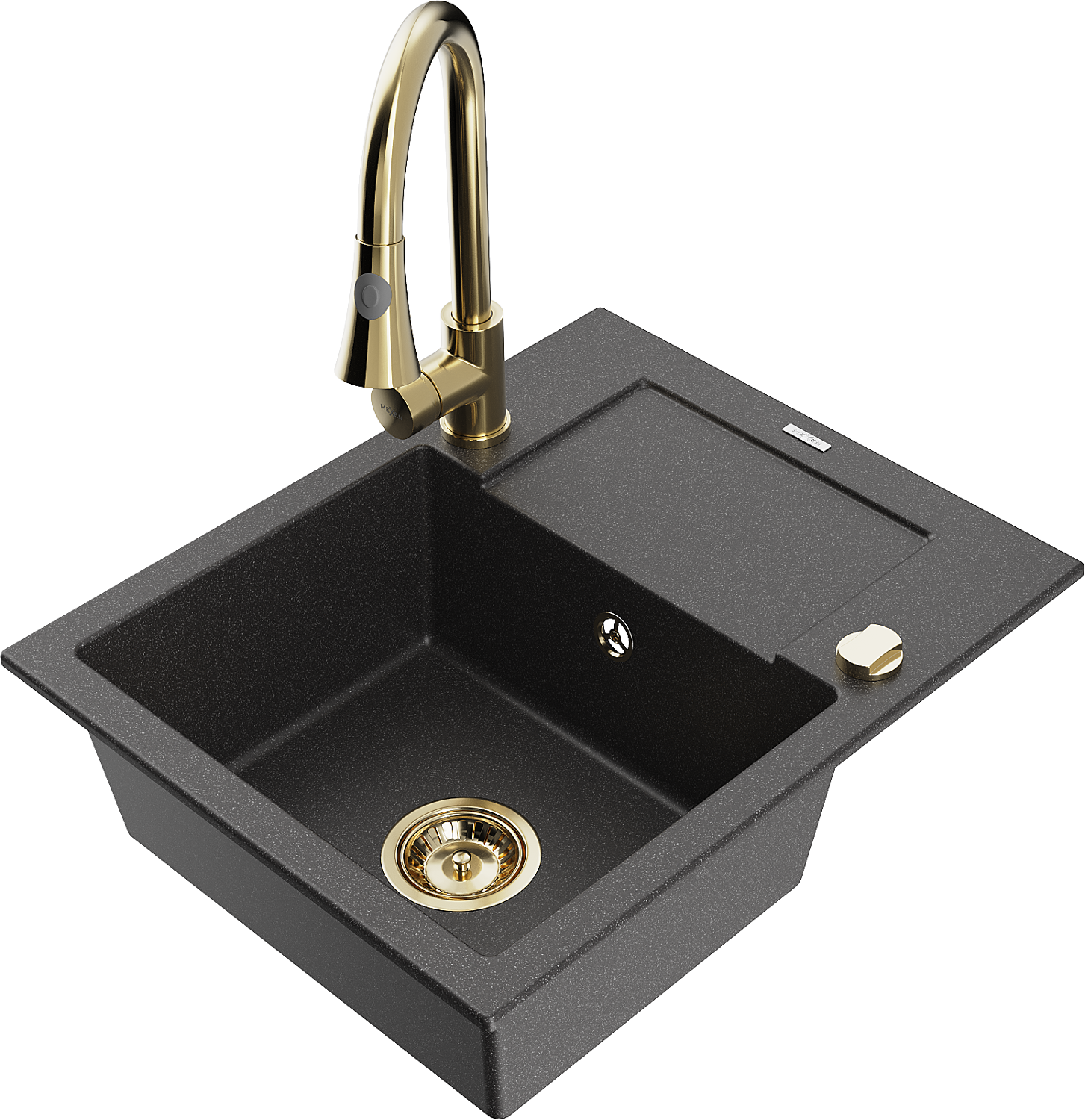 Mexen Enzo chiuvetă granit cu 1 compartiment și scurgător și baterie de bucătărie Elia, negru cu pete - 6506-76-670101-50