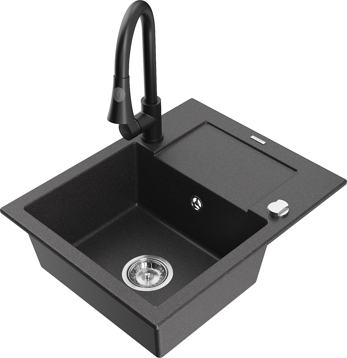 Mexen Enzo chiuvetă de granit cu 1 compartiment, cu scurgător și baterie de bucătărie Elia, neagră cu pete