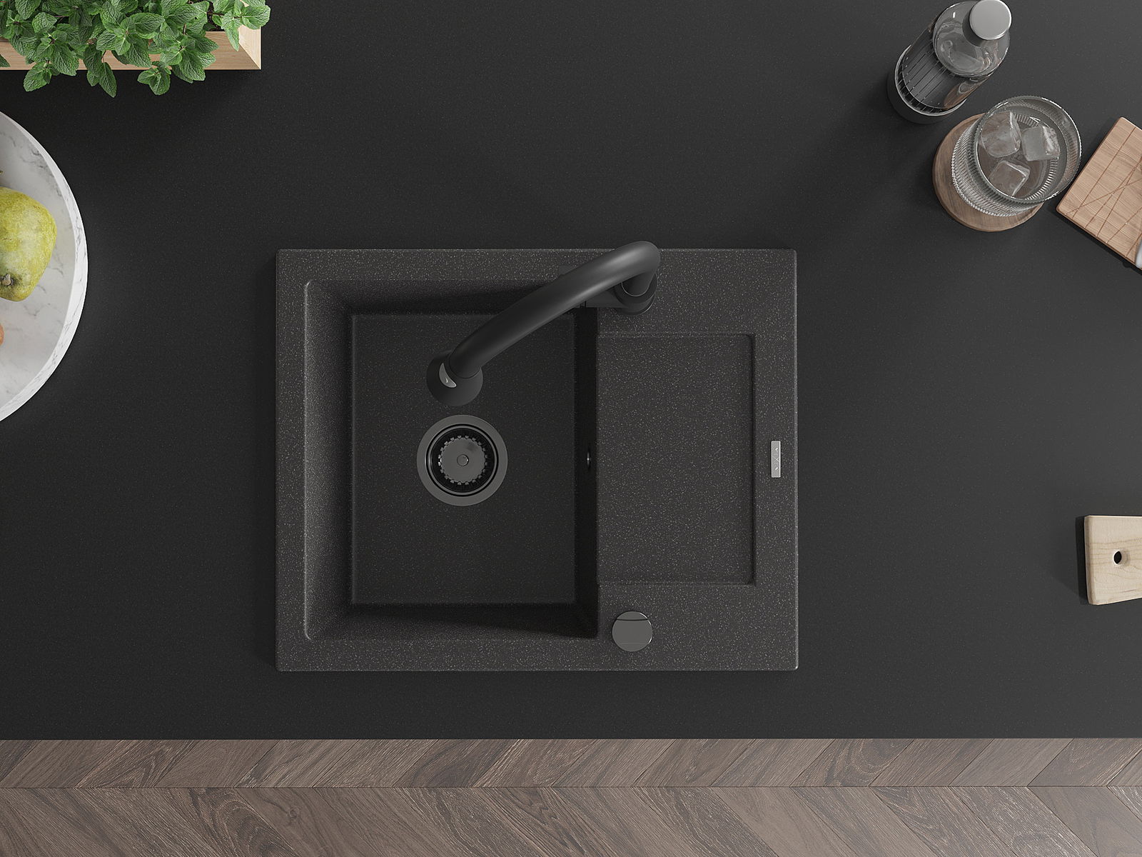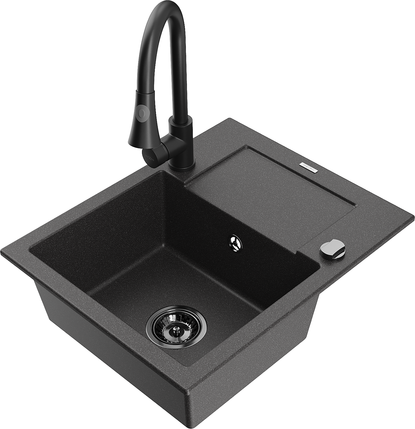 Mexen Enzo chiuvetă din granit cu 1 compartiment, cu uscător și baterie de bucătărie Elia, negru cu pete