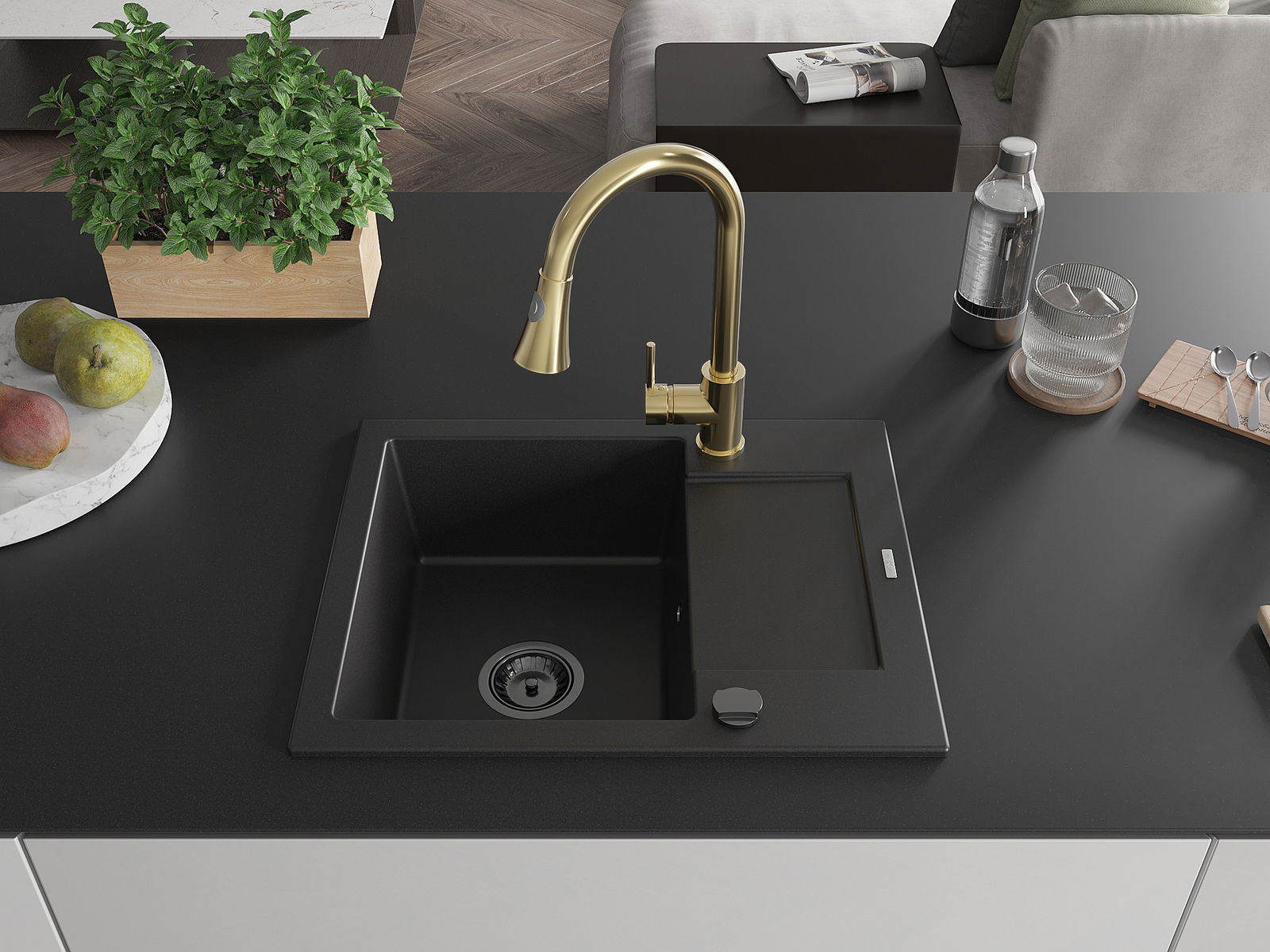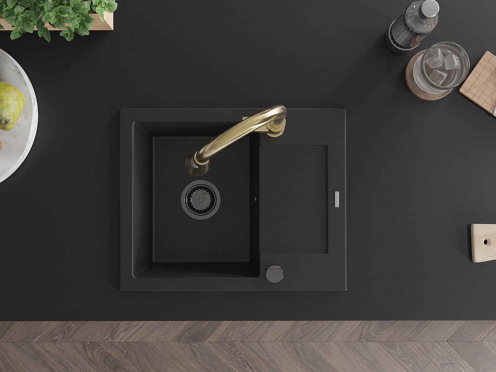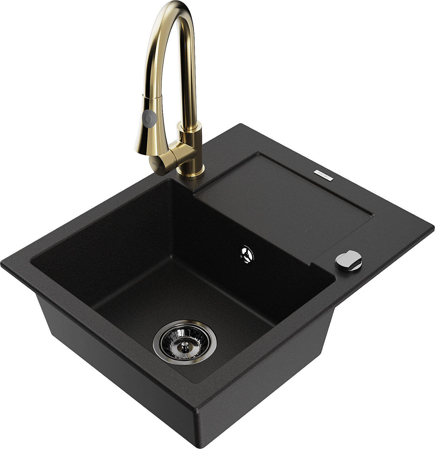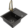 Mexen Enzo chiuvetă de bucătărie din granit cu o singură cuvă, cu picurător și baterie Elia, negru - 6506-77-670101-50-B
