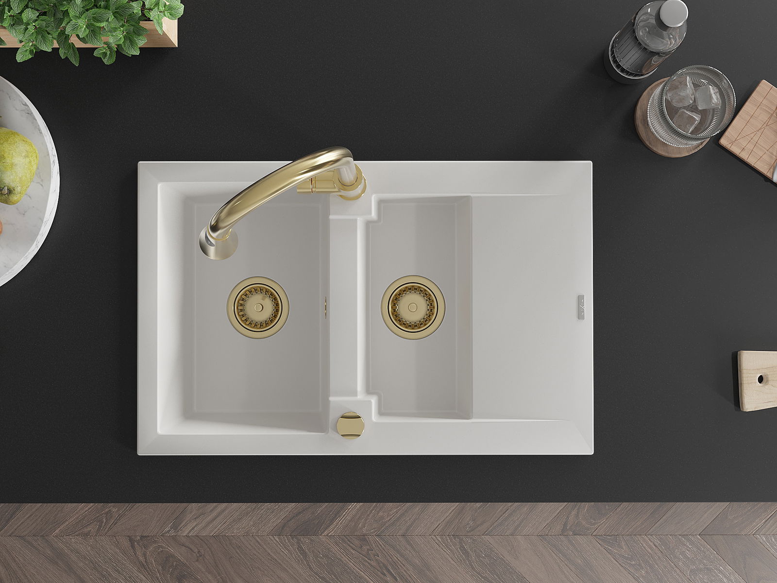 Mexen Gaspar chiuvetă de bucătărie din granit cu 1,5 compartimente și picurător și baterie de bucătărie Elia, alb - 6507-20-670?