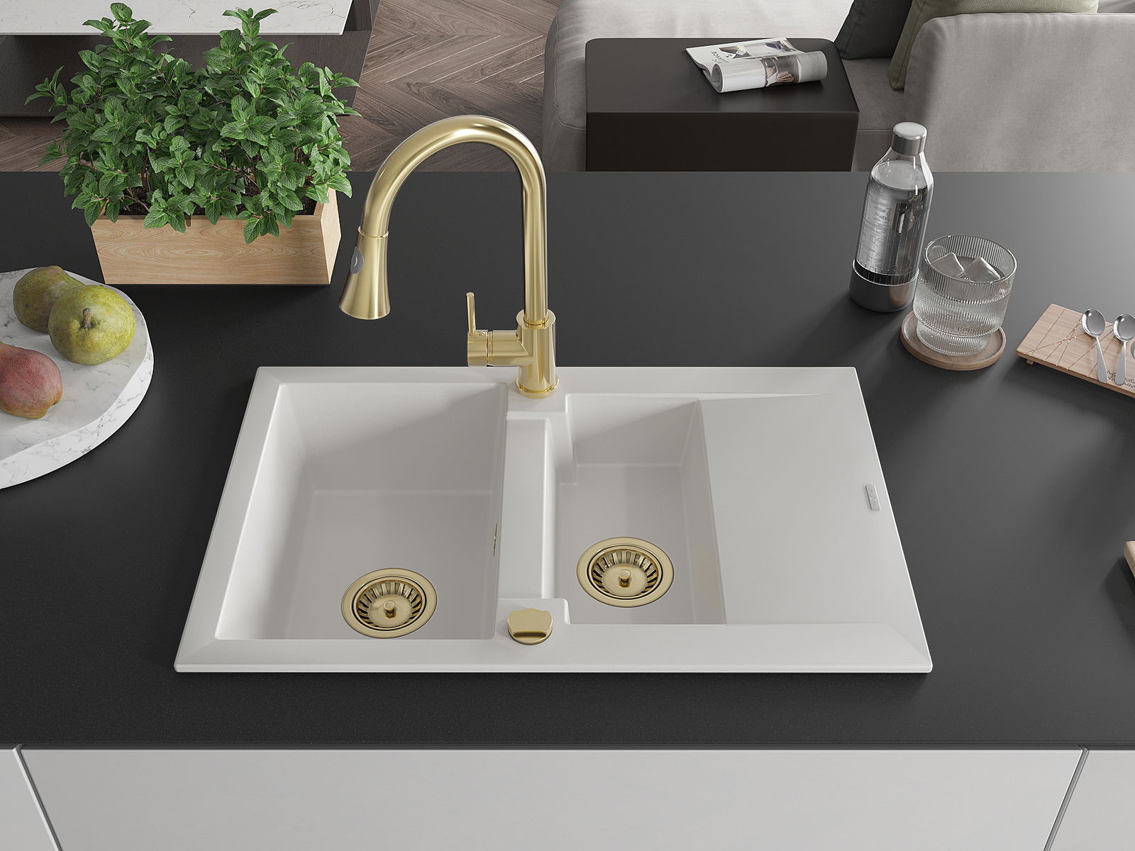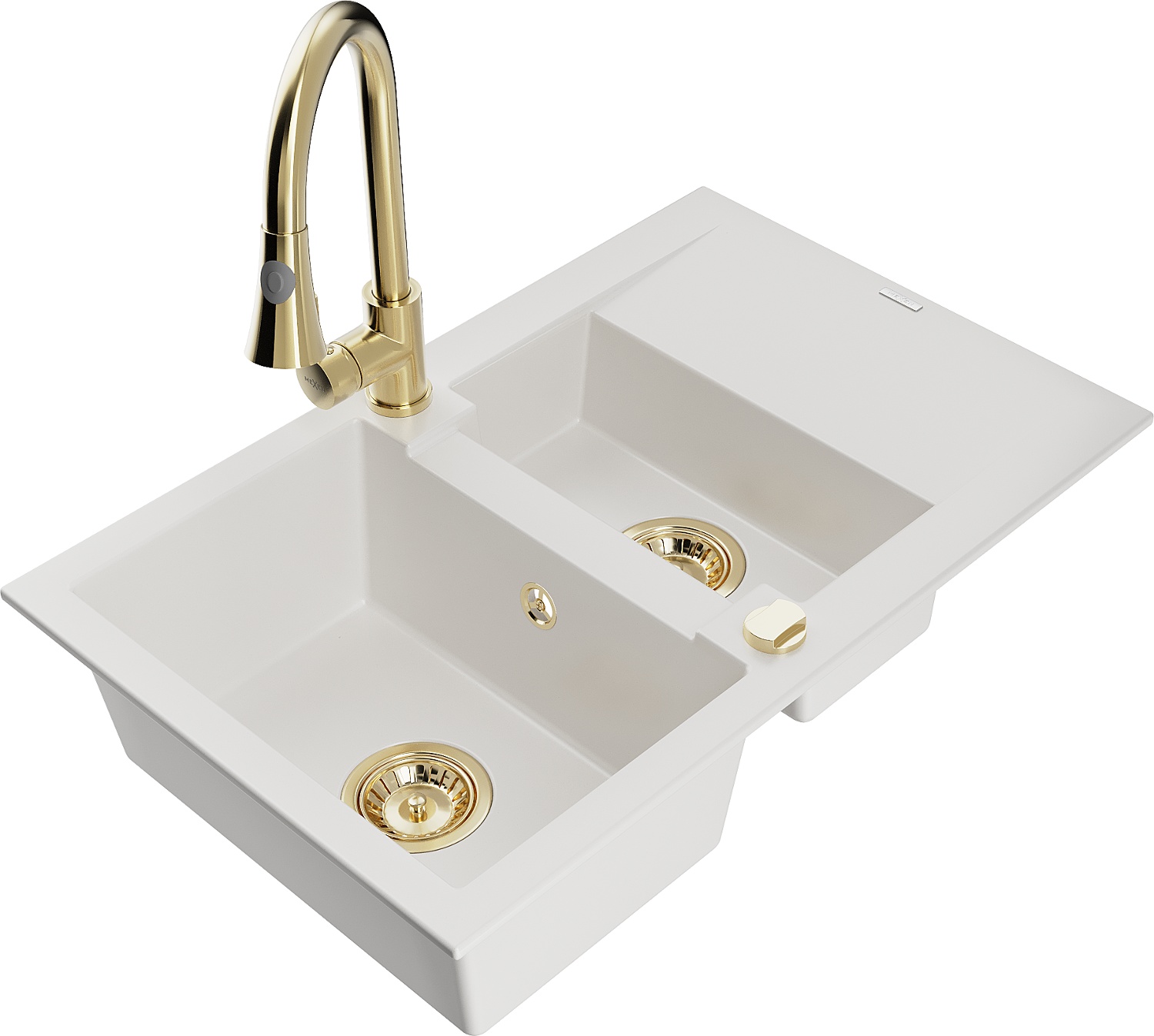 Mexen Gaspar chiuvetă de bucătărie din granit cu 1,5 cuve cu picurător și baterie Elia, alb - 6507-20-670101-50