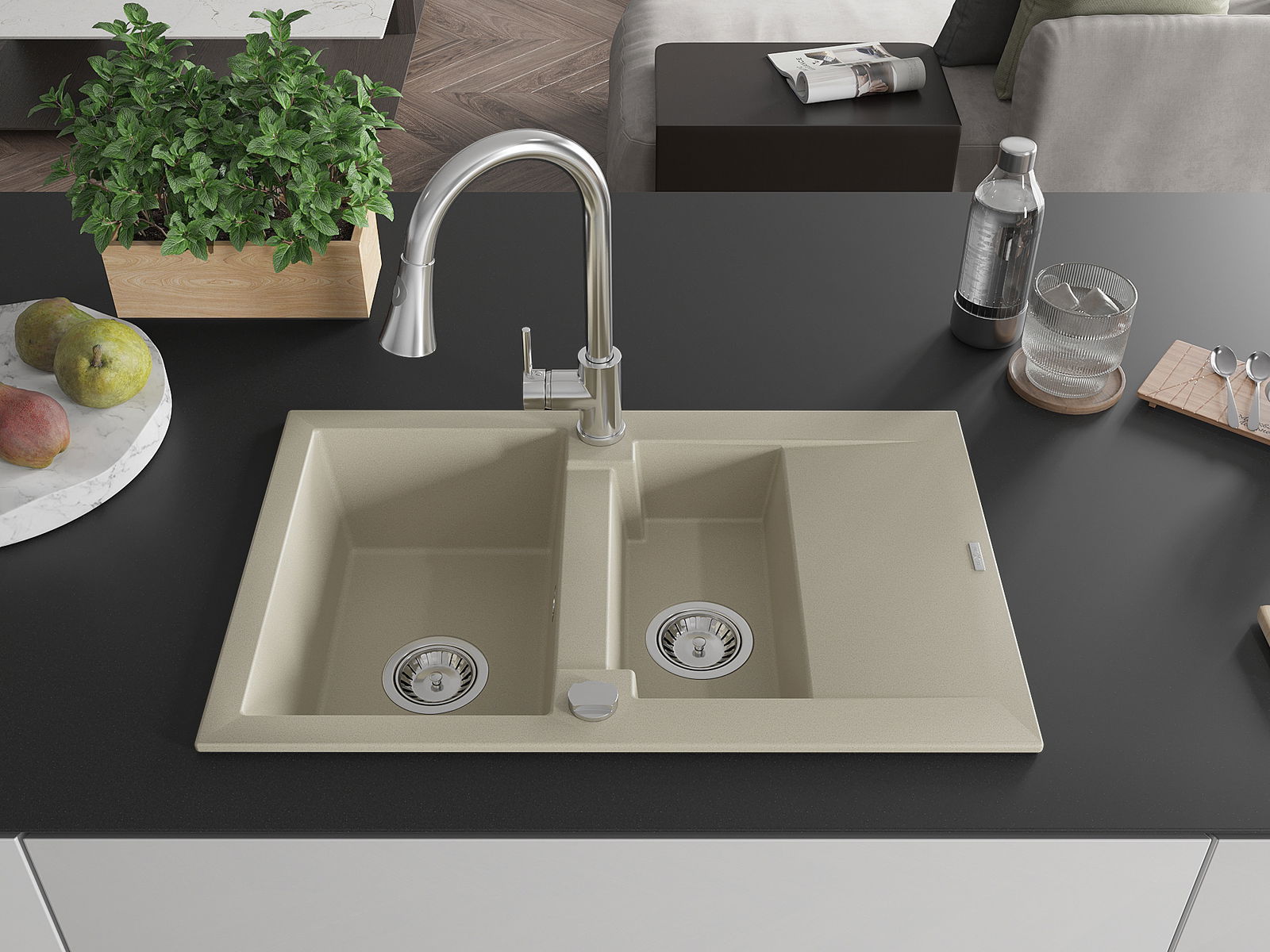 Suprafața chiuvetei este rezistentă la pete și decolorarea, datorită căreia este ușor de curățat și își păstrează culoarea mult timp. Estetică și practic completarea fiecărei bucătării.