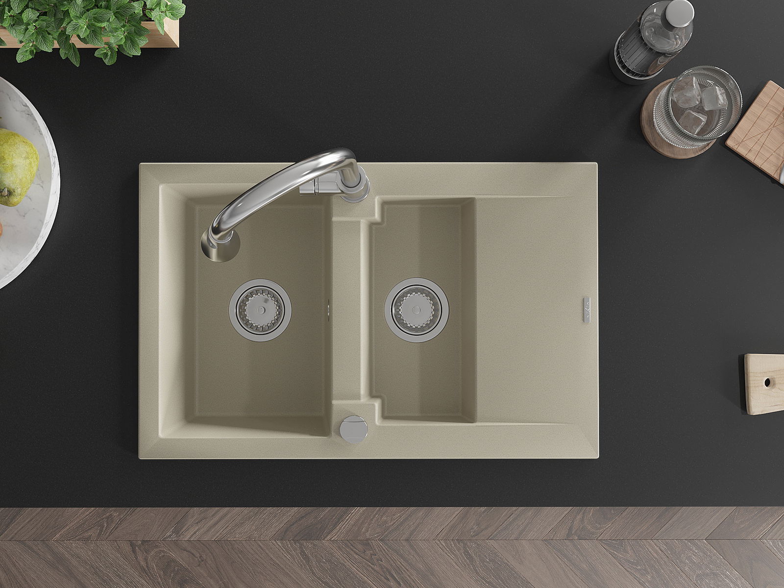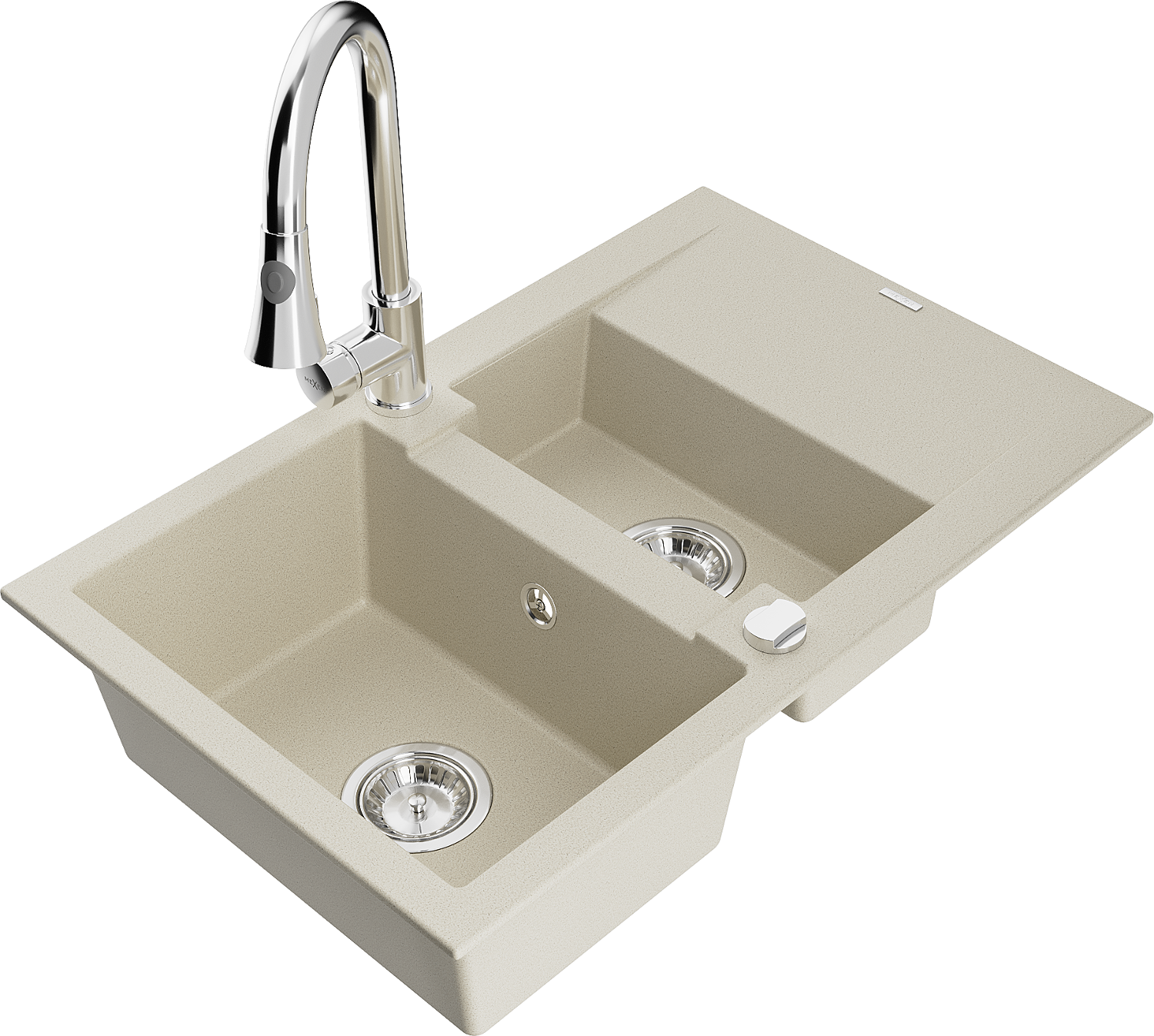 Mexen Gaspar chiuvetă de granit cu 1,5 compartimente, cu picurător și baterie de bucătărie Elia, bej - 6507-69-670101-00