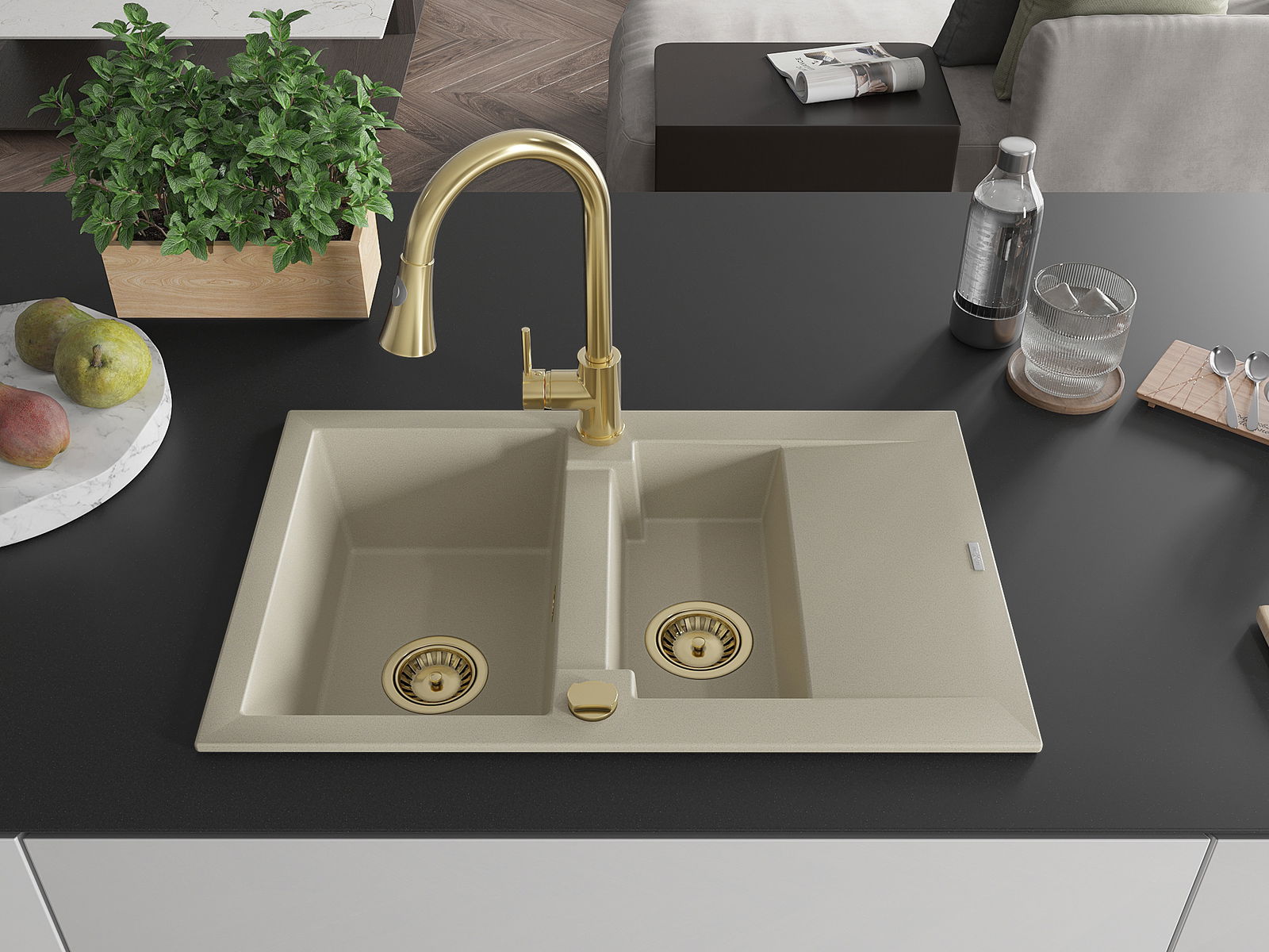 Mexen Gaspar chiuvetă de bucătărie din granit, 1,5 cuve cu scurgător și baterie de bucătărie Elia, bej - 6507-69-670101-50