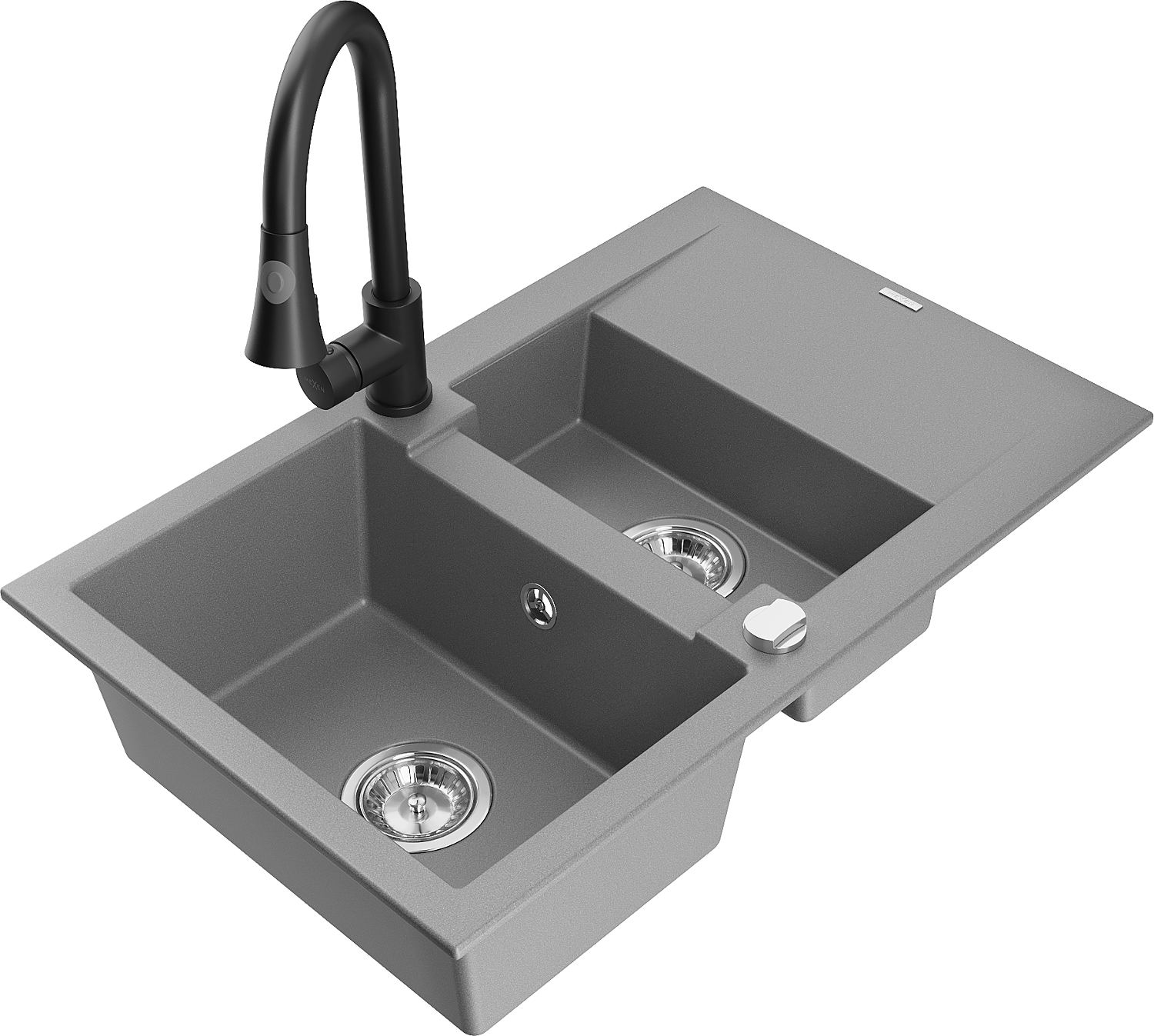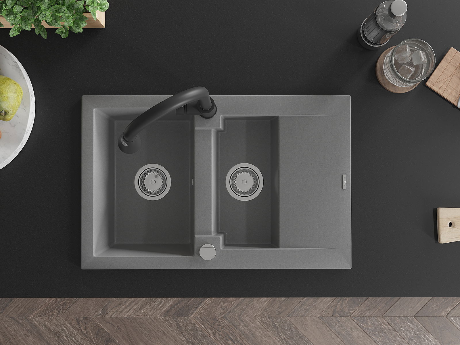 Mexen Gaspar chiuvetă de granit cu 1,5 compartimente cu scurgător și baterie de bucătărie Elia, gri - 6507-71-670101-70