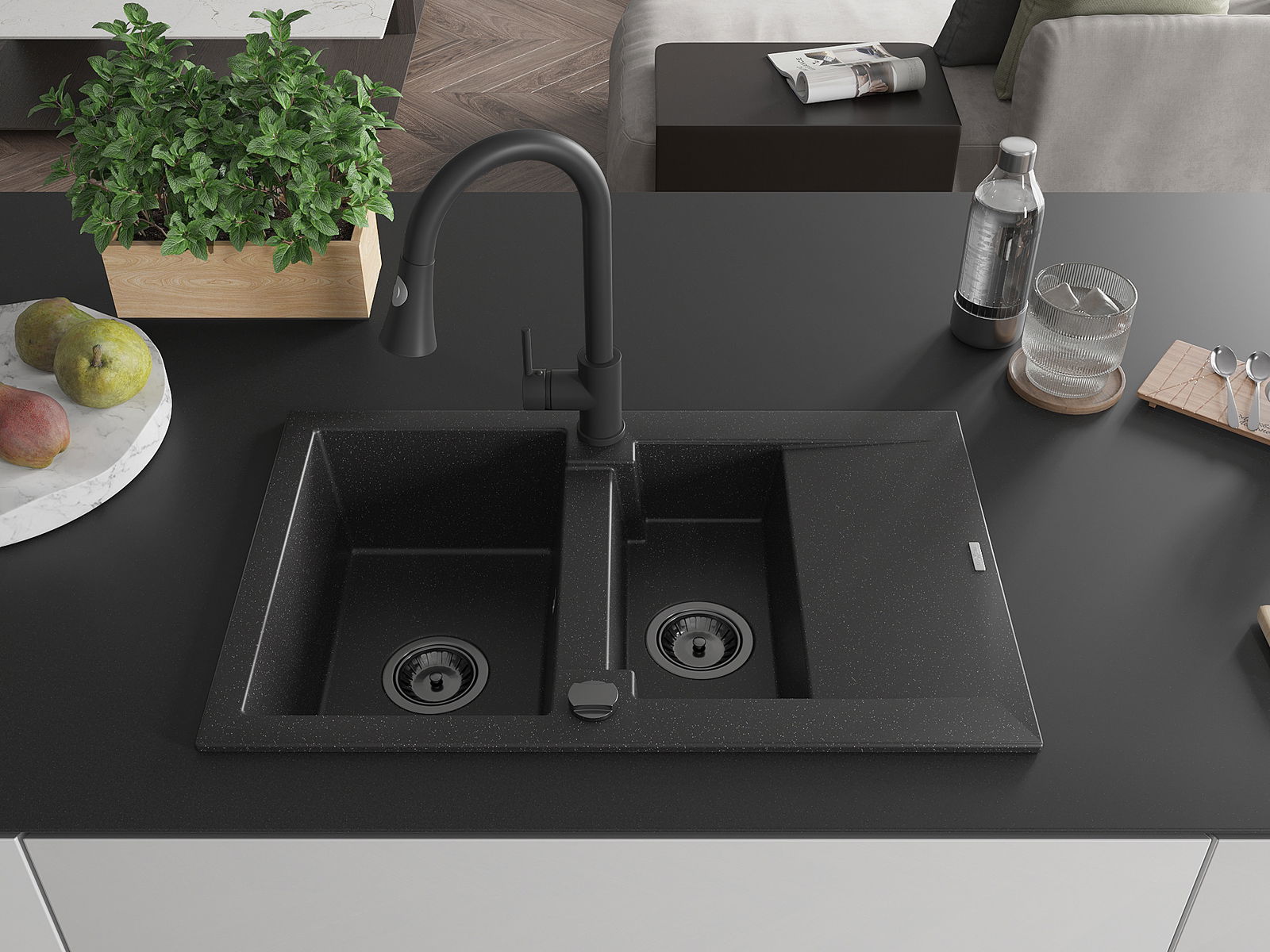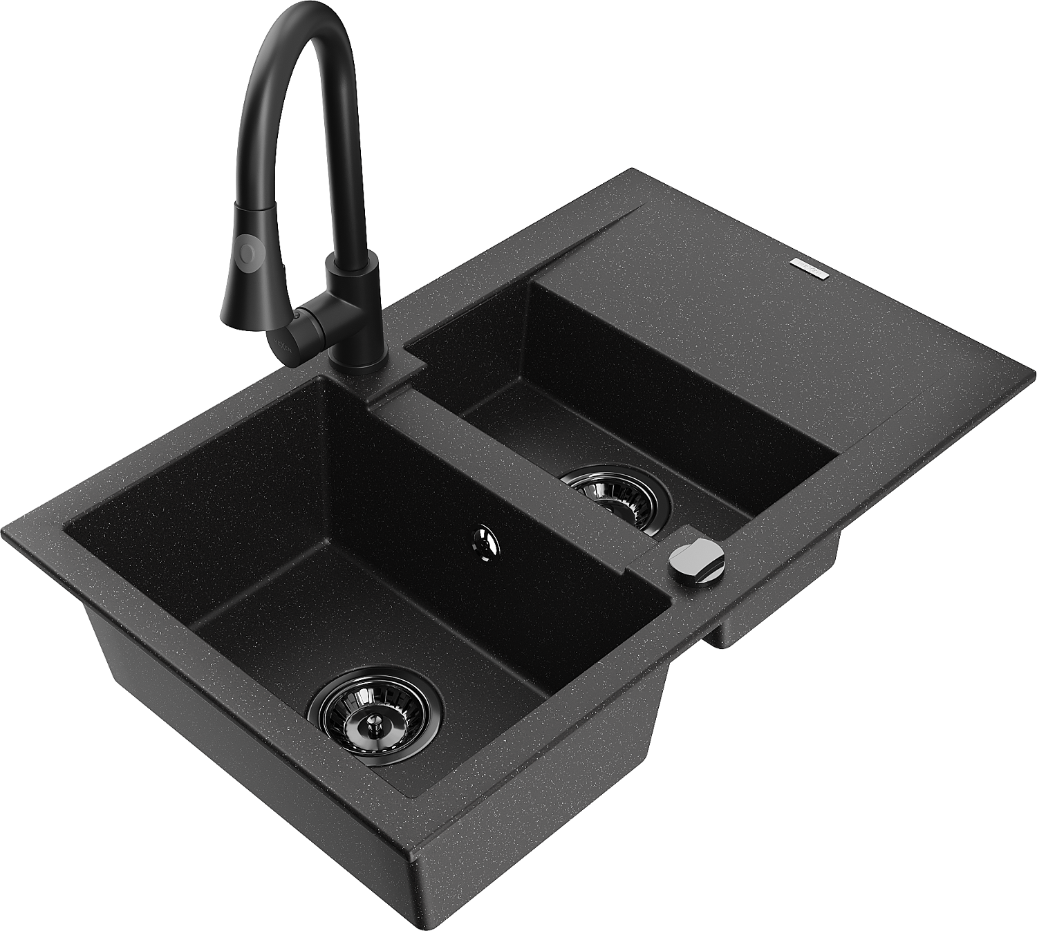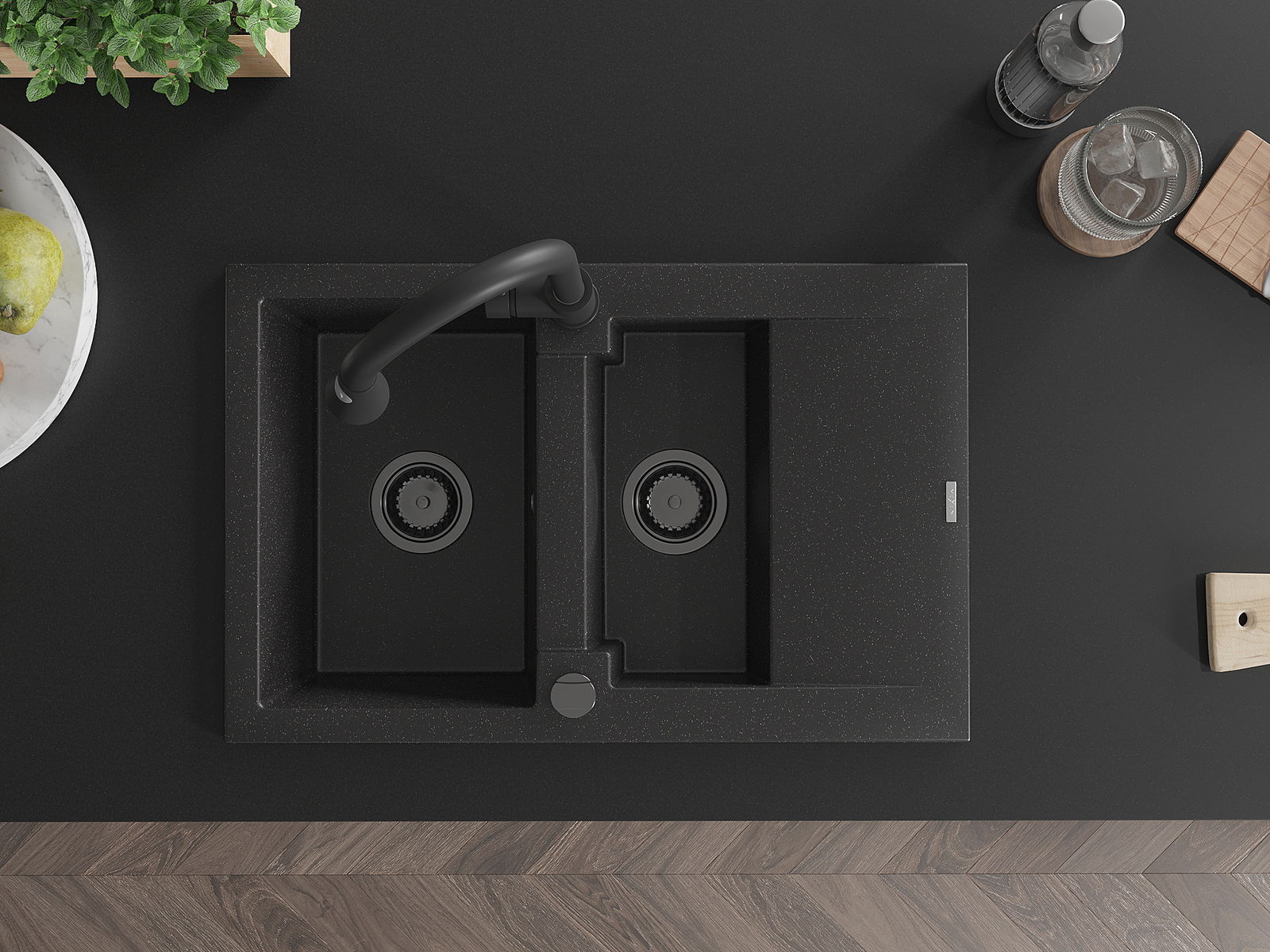 Mexen Gaspar chiuvetă de bucătărie din granit cu 1,5 compartimente, cu scurgător și baterie Elia, negru/argintiu