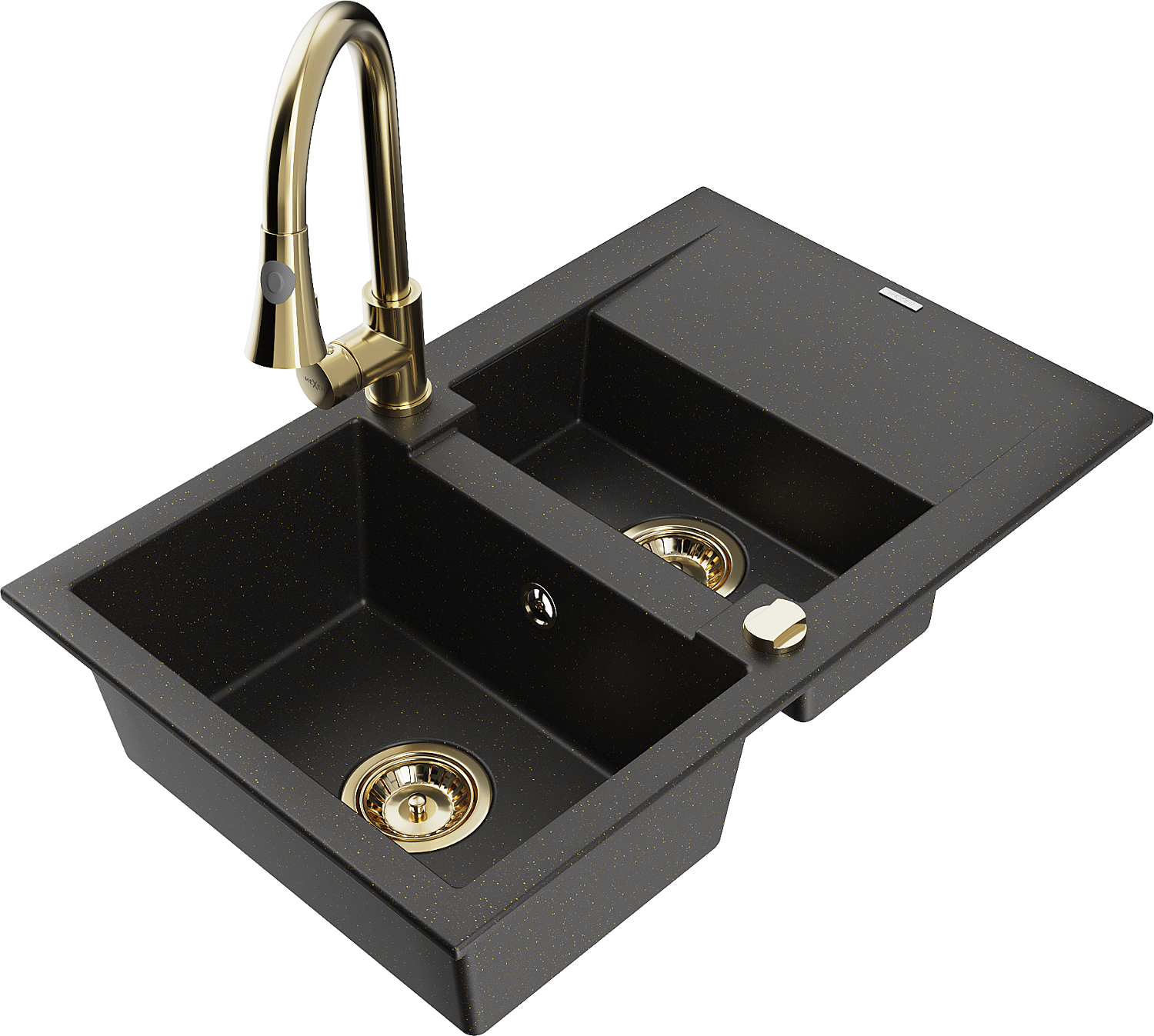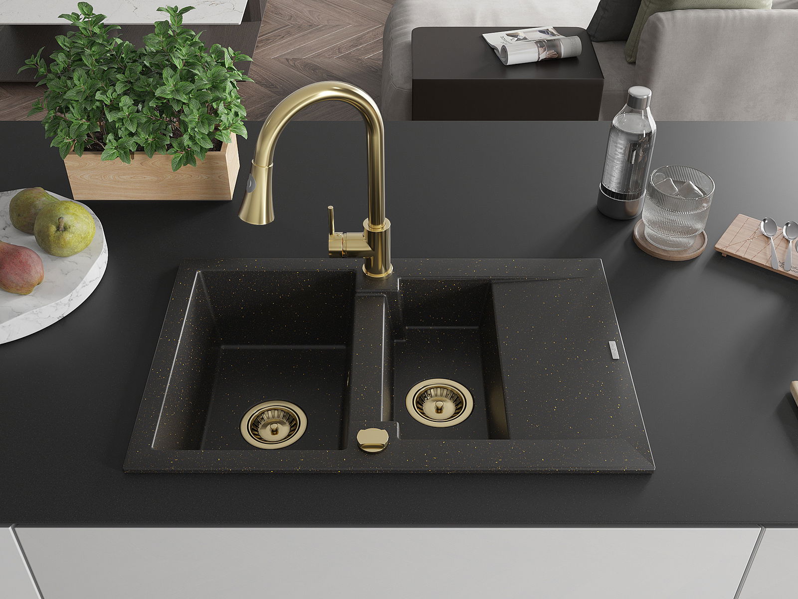 Mexen Gaspar chiuvetă de granit 1,5 camere cu scurgător și baterie de bucătărie Elia, negru/auriu metalic - 6507-75-670101-50