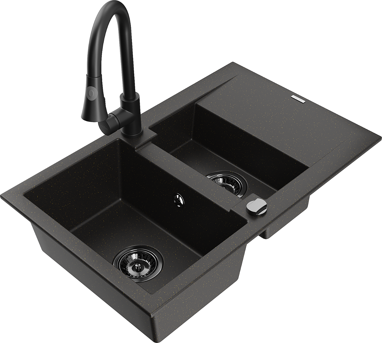 Mexen Gaspar chiuvetă din granit cu 1,5 compartimente, cu picurător și baterie de bucătărie Elia, negru/auriu metalic