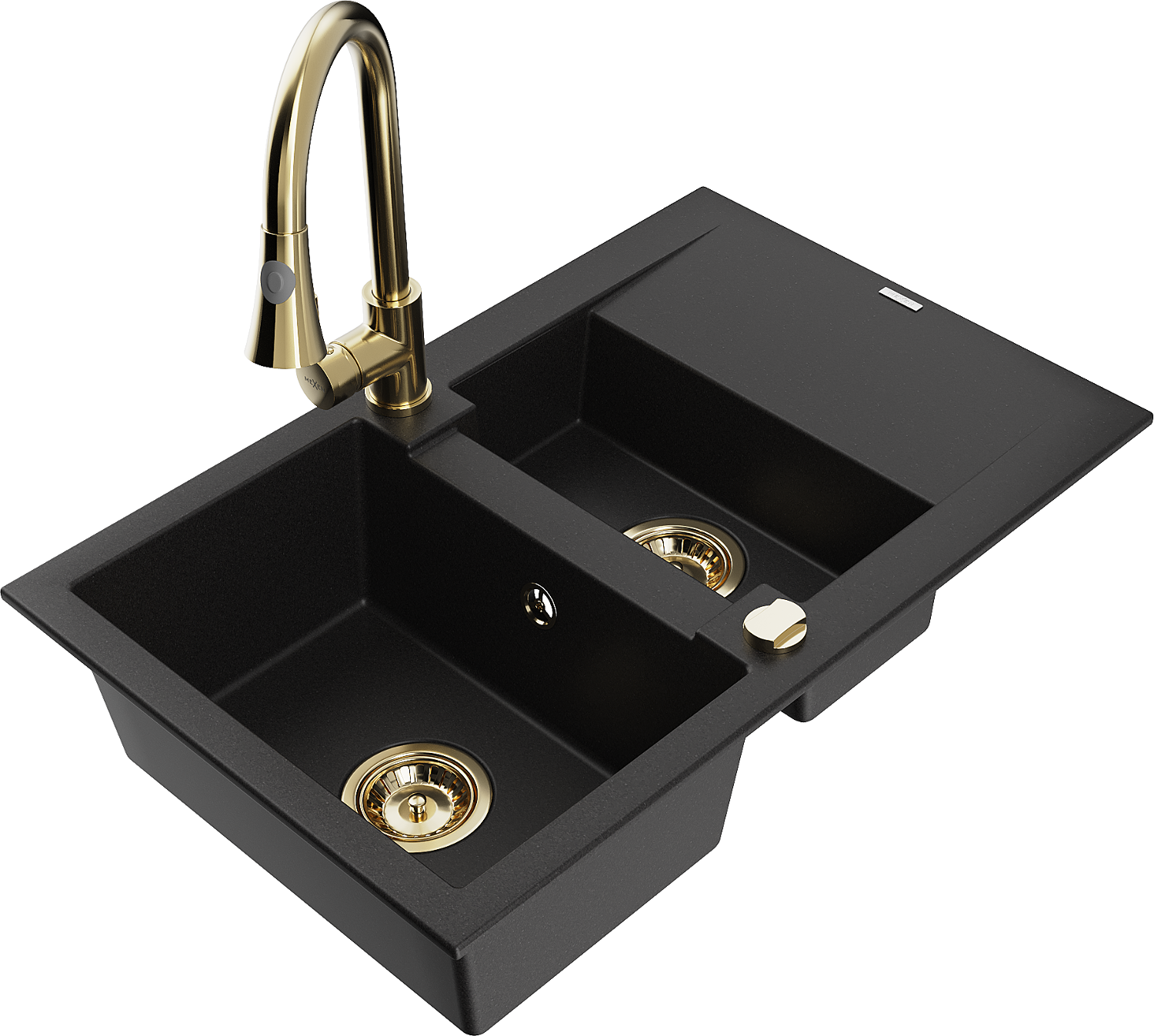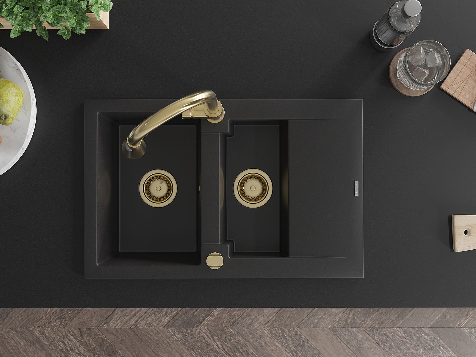 Mexen Gaspar chiuvetă de granit 1,5 cuve cu rigolă și baterie de bucătărie Elia, negru - 6507-77-670101-50