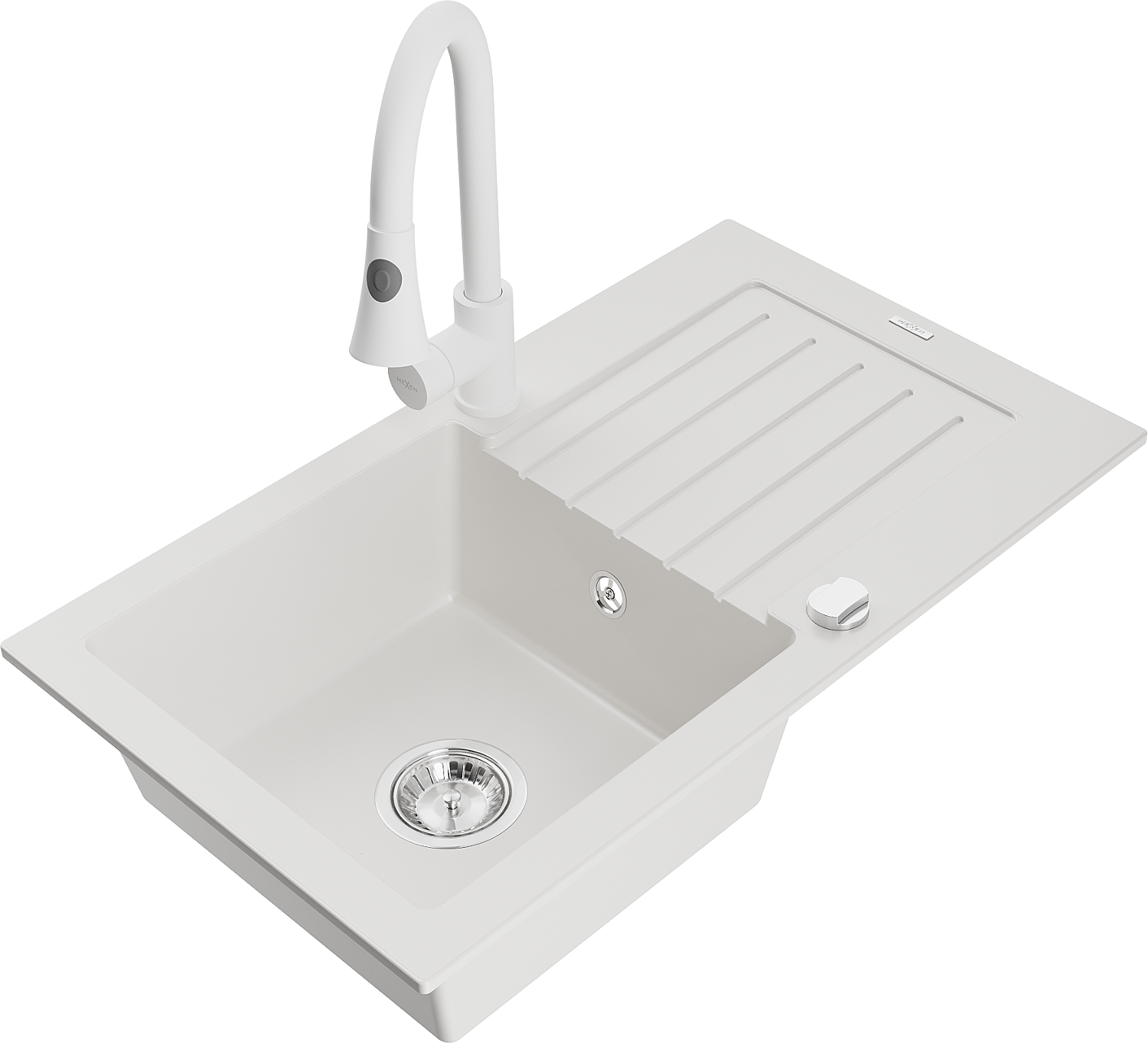 Mexen Pablo chiuvetă de granit cu 1 cameră și picurător și baterie de bucătărie Elia, alb - 6510-20-670101-20