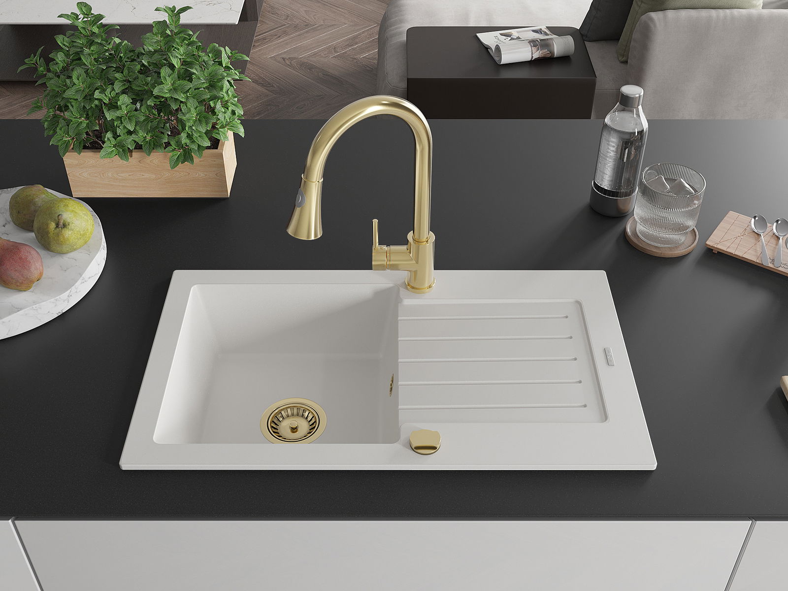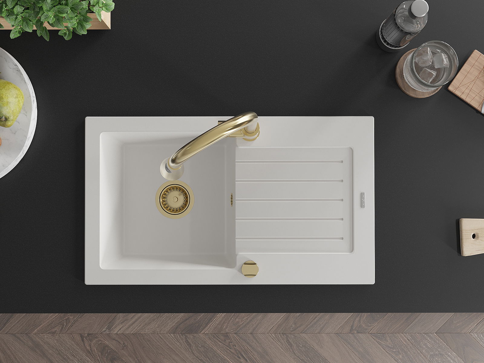 Mexen Pablo chiuvetă de bucătărie din granit cu o singură cuvă și scurgător și baterie Elia, alb - 6510-20-670101-50