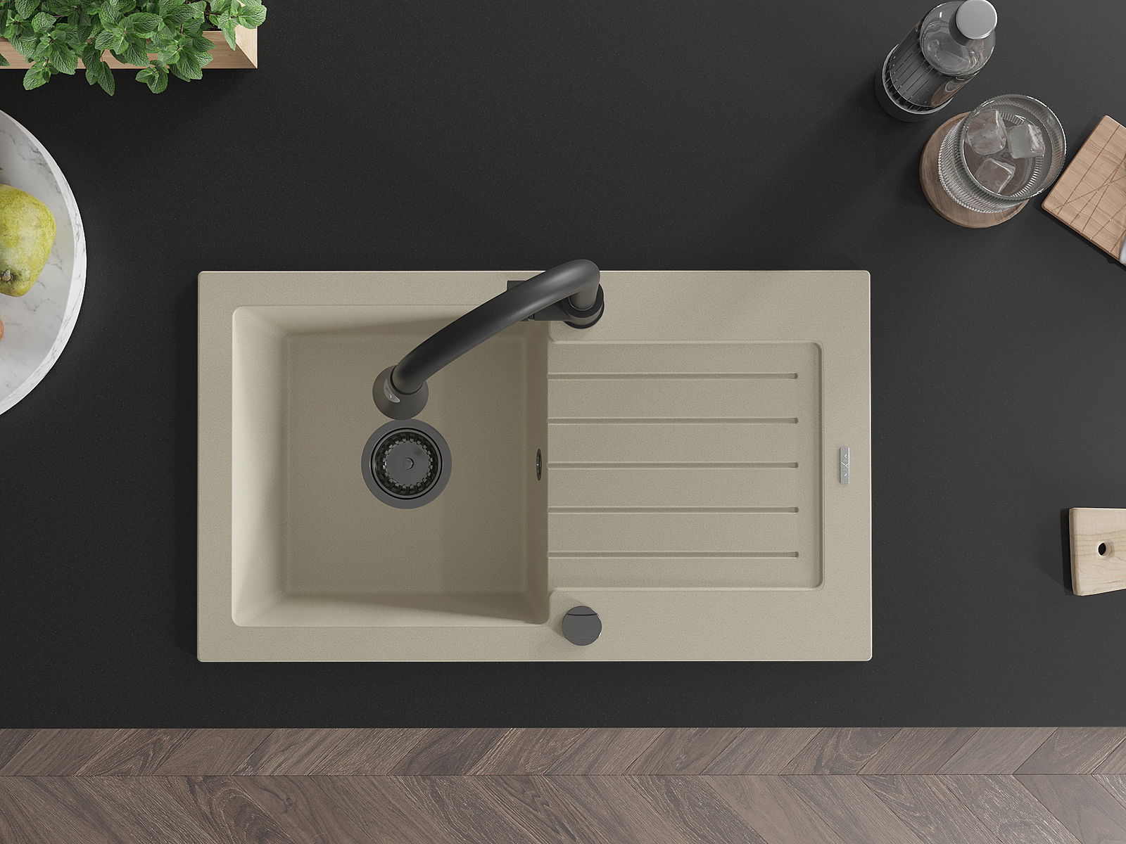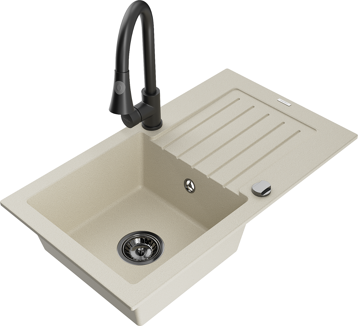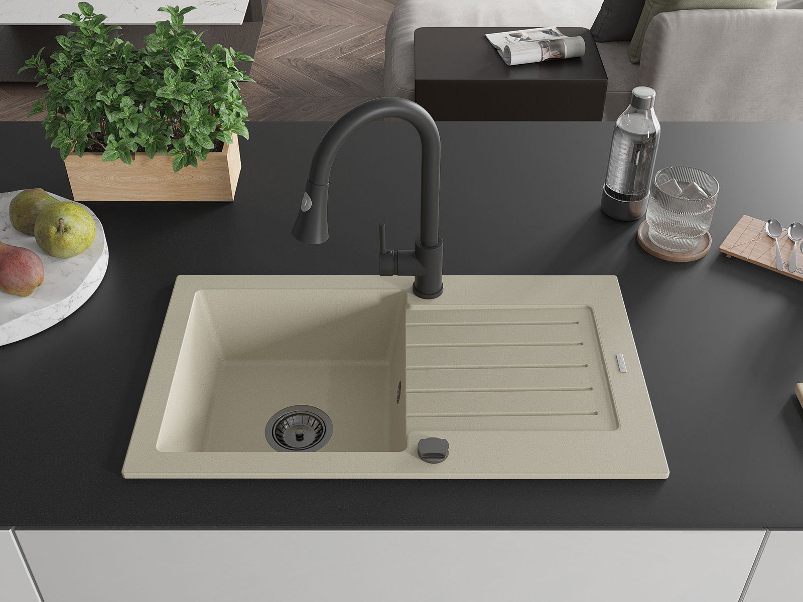 Mexen Pablo chiuvetă de bucătărie din granit cu 1 compartiment cu picurător și baterie Elia, bej - 6510-69-670101-70