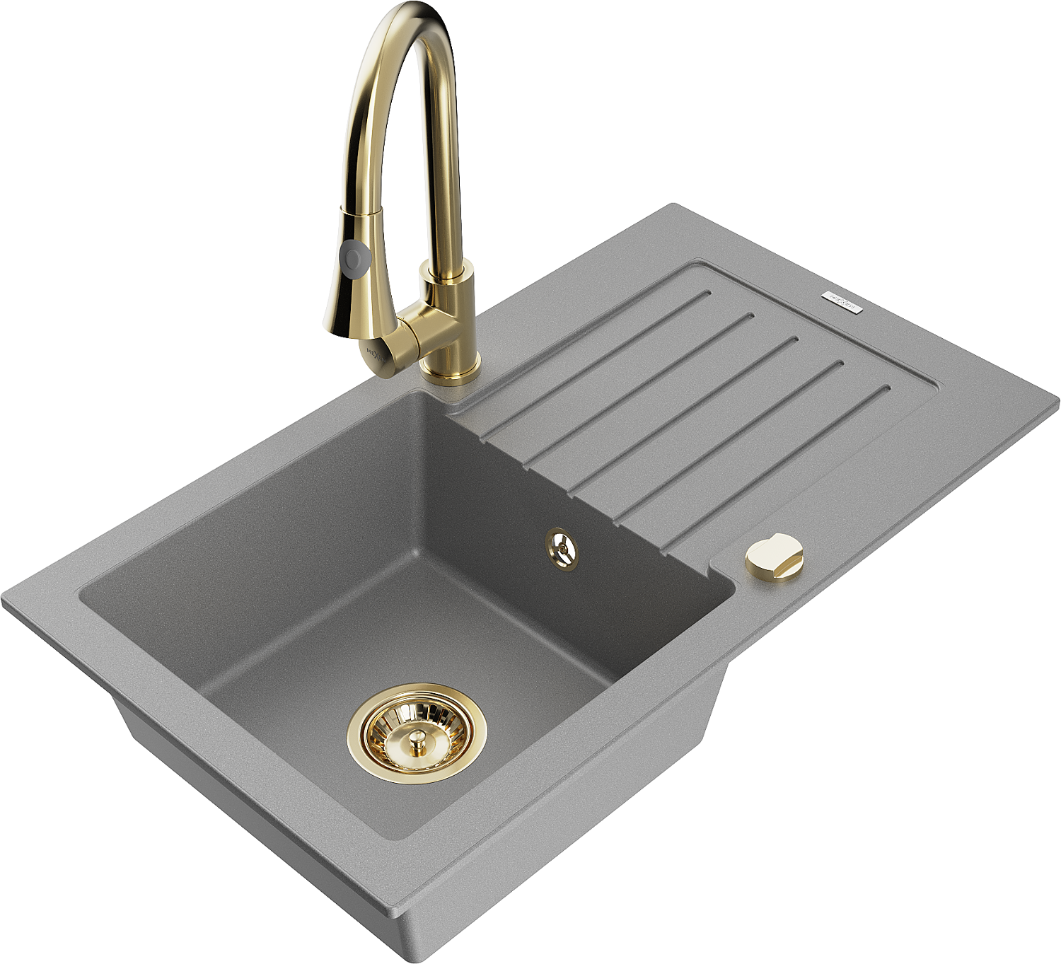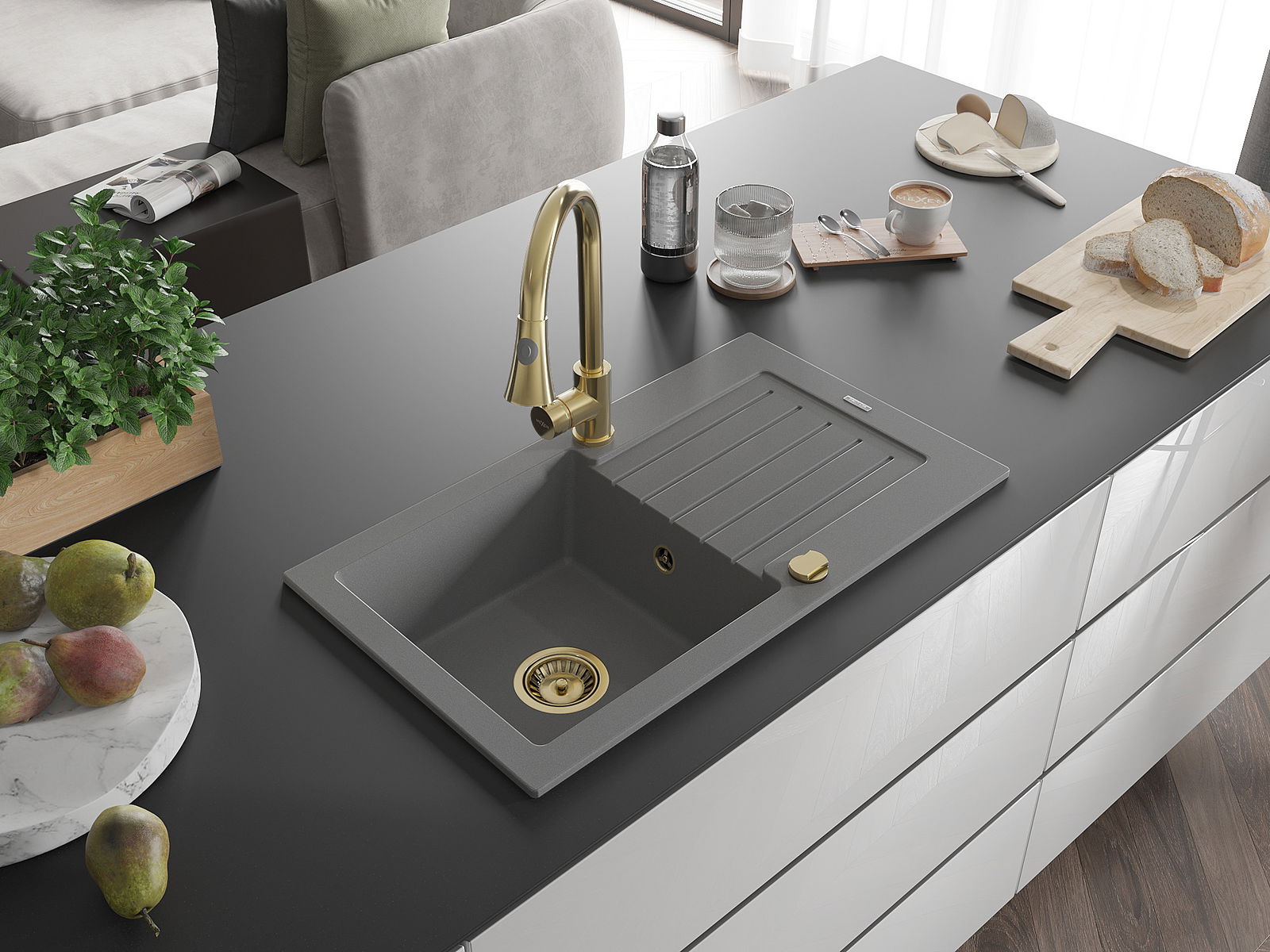 Mexen Pablo chiuvetă de bucătărie din granit cu 1 cuvă cu picurător și baterie de bucătărie Elia, gri - 6510-71-670101-50