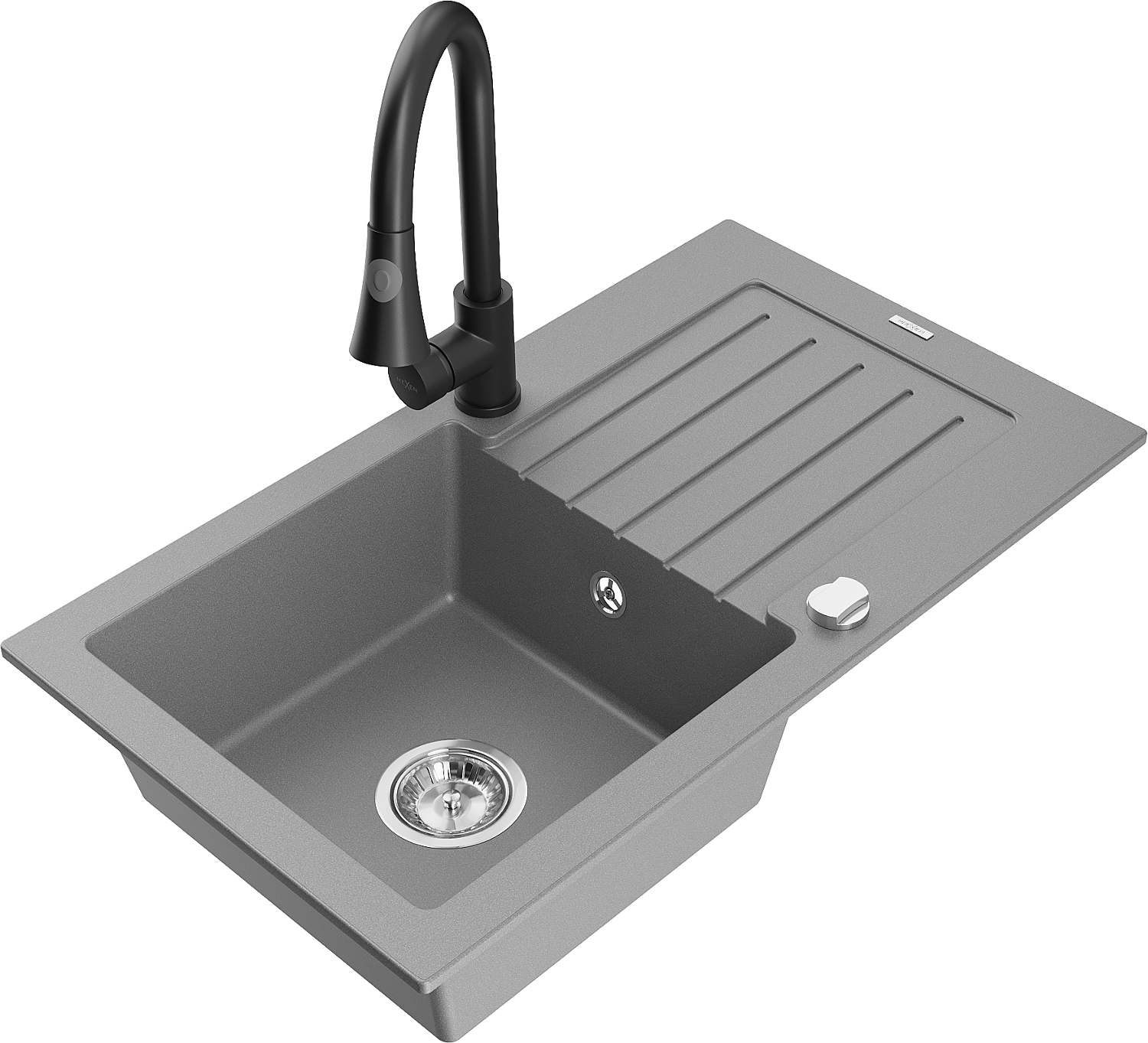 Mexen Pablo chiuvetă granitică cu 1 compartiment și scurgător, cu baterie de bucătărie Elia, gri - 6510-71-670101-70