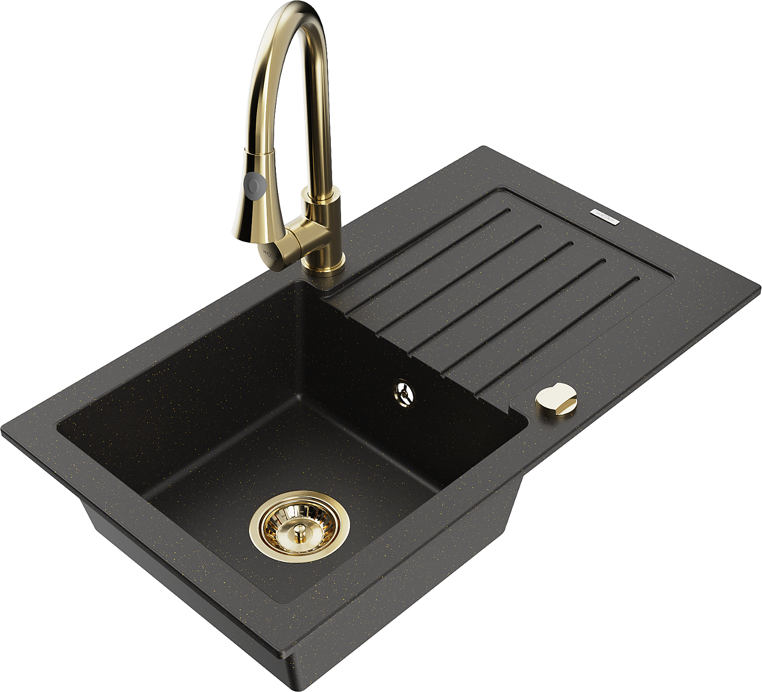 Mexen Pablo chiuvetă de bucătărie din granit cu 1 compartiment și scurgător și baterie de bucătărie Elia, negru/auriu metalic -?