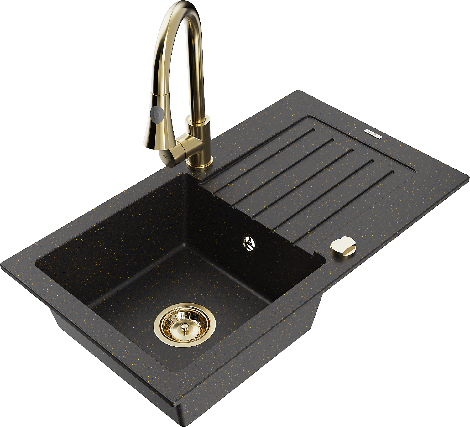 Mexen Pablo chiuvetă granitică cu 1 compartiment cu scurgător și baterie de bucătărie Elia, negru/auriu metalic