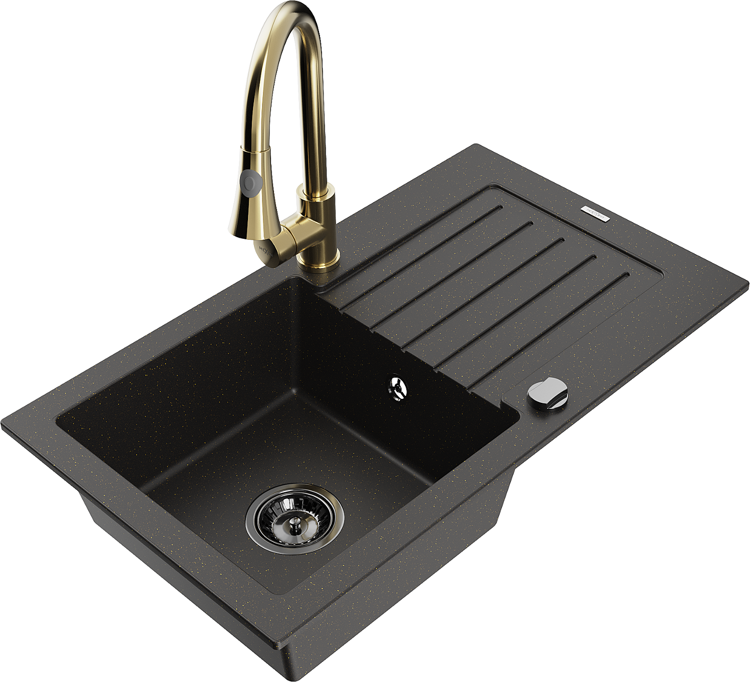 Mexen Pablo chiuvetă de bucătărie din granit cu 1 compartiment, cu scurgător și baterie Elia, negru/auriu metalizat