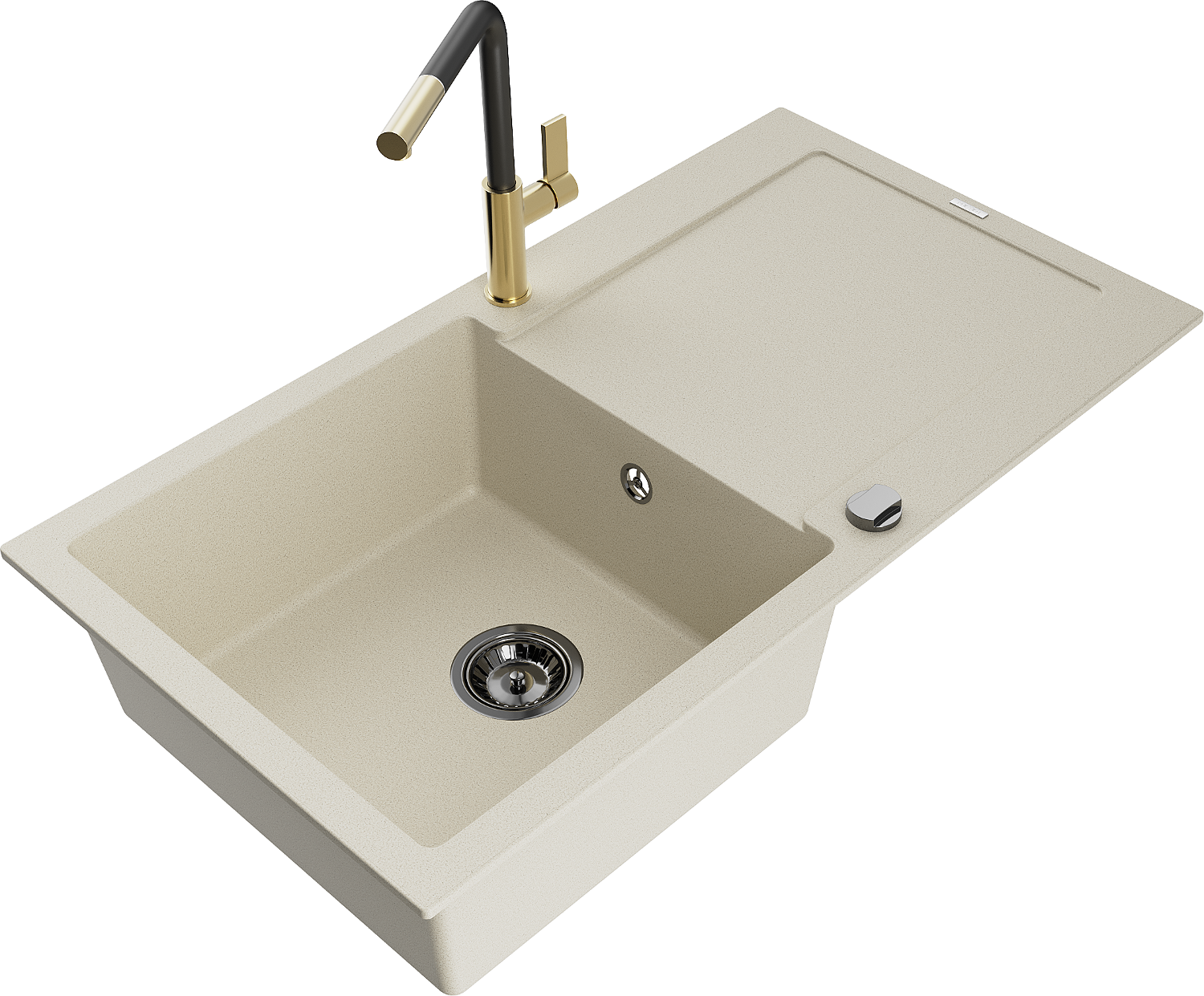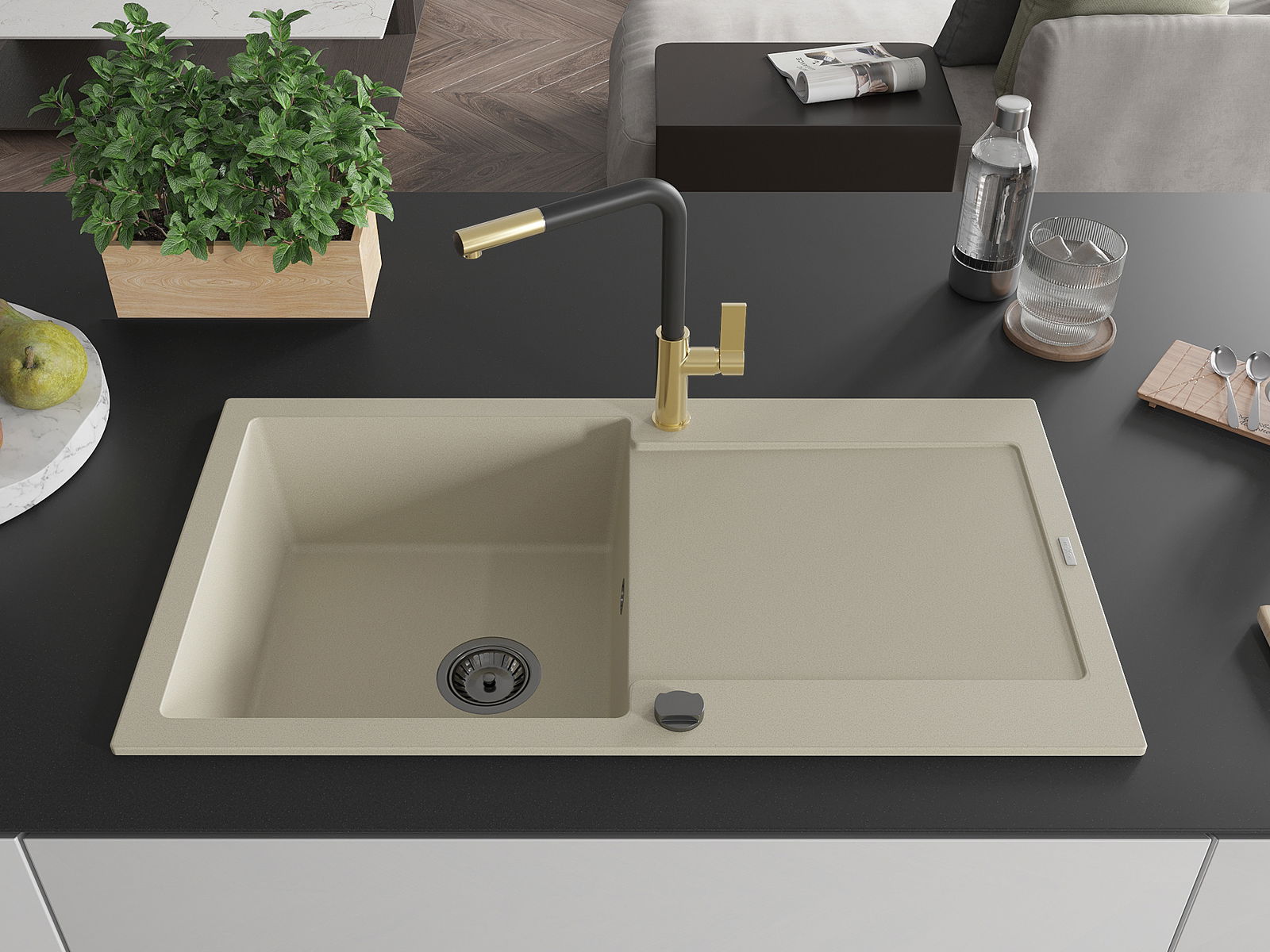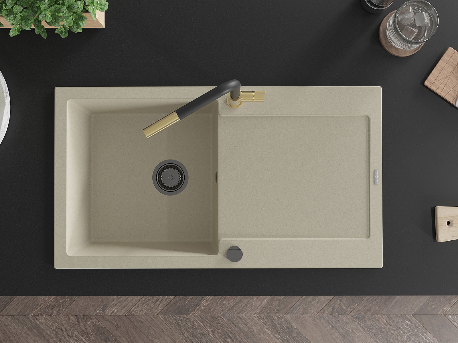 Mexen Leo chiuvetă granit 1-cuvă cu scurgător și baterie de bucătărie Flora, bej - 6501-69-670401-57-B
