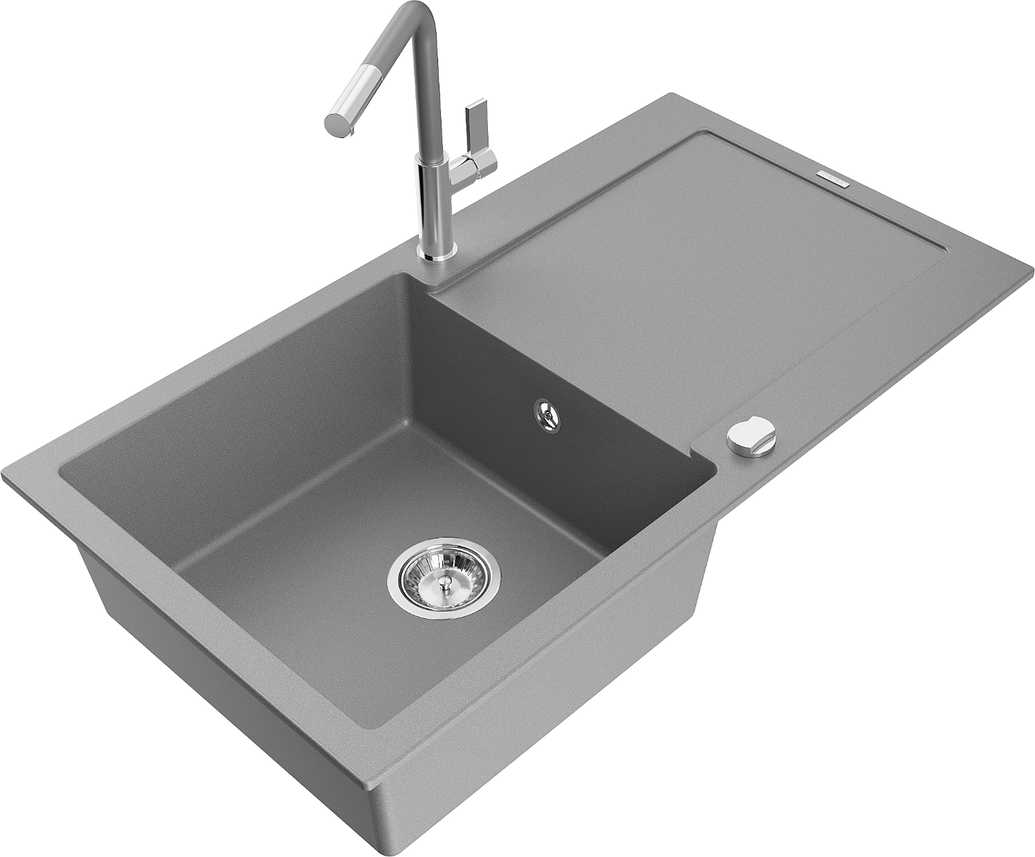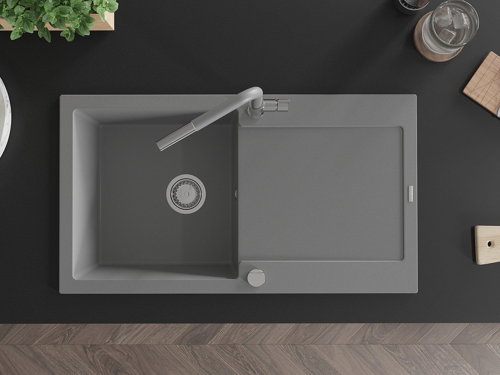 Mexen Leo chiuvetă de granit cu 1 cameră și scurgător și robinet de bucătărie Flora, gri - 6501-71-670401-06
