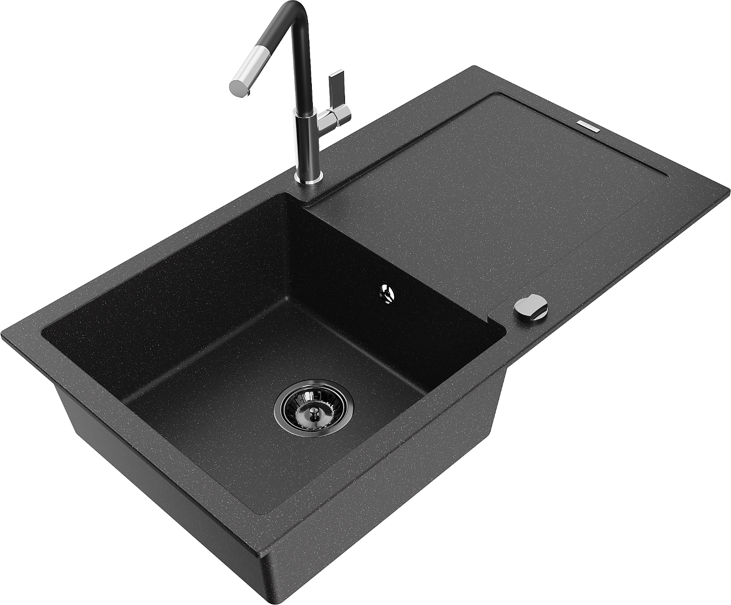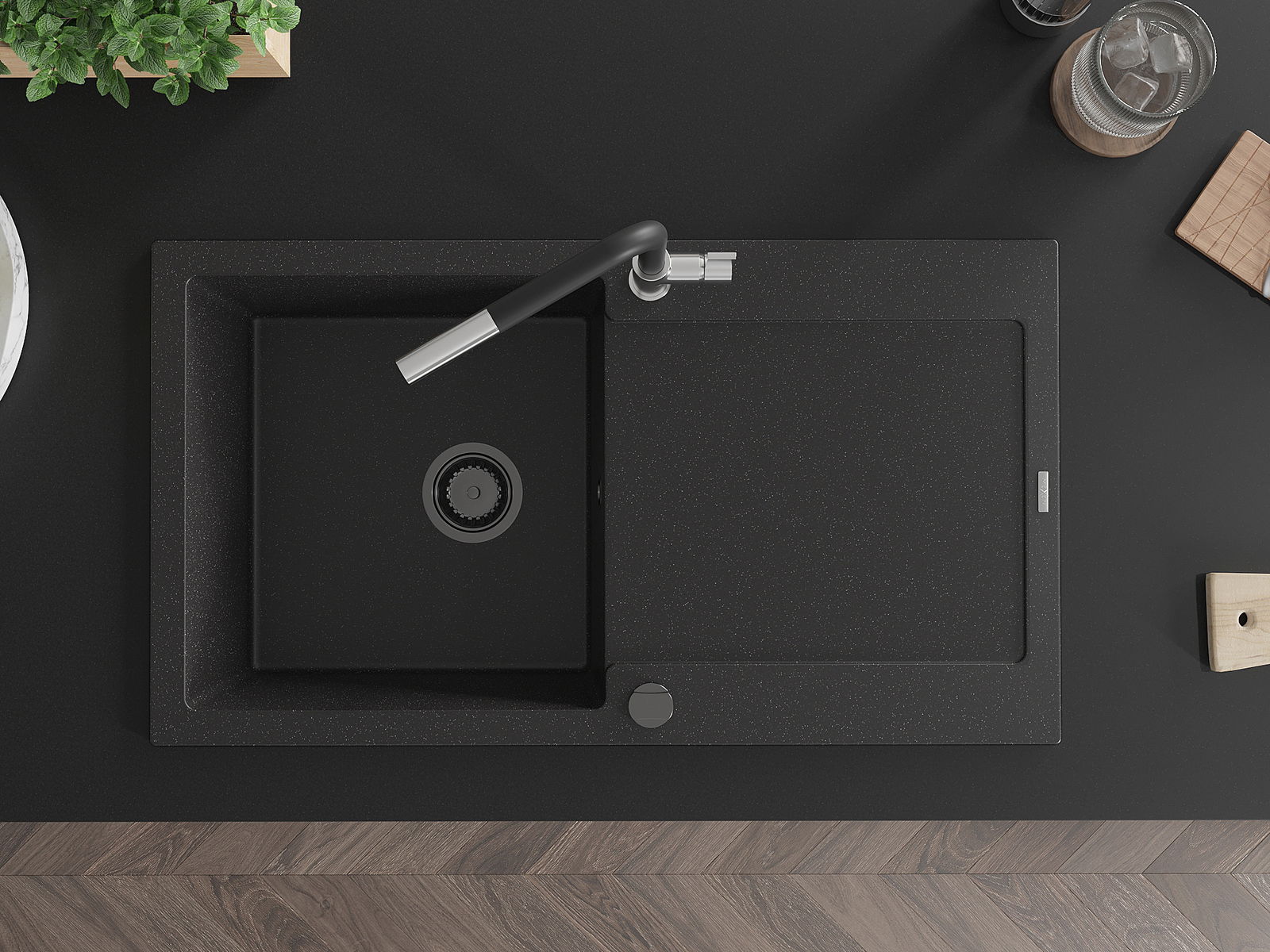 Mexen Leo chiuvetă de bucătărie din granit cu 1 compartiment, cu picurator și baterie de bucătărie Flora, negru/metalic