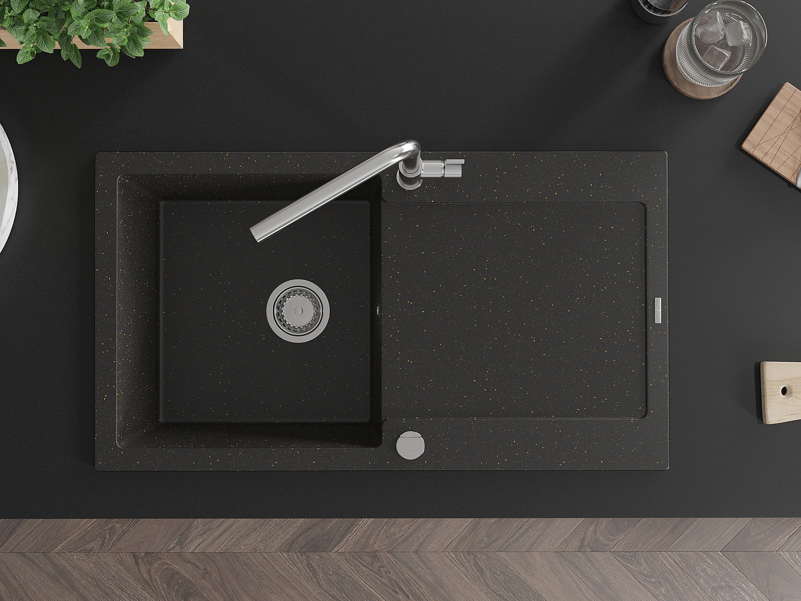 Mexen Leo chiuvetă de bucătărie din granit, cu 1 compartiment, cu picurător și robinet de bucătărie Flora, negru/auriu