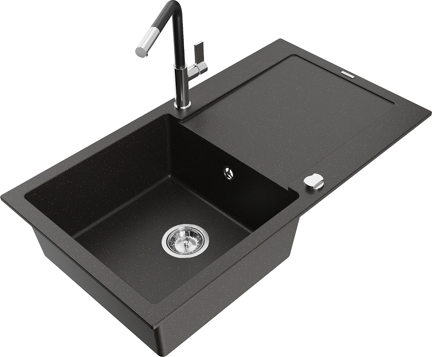 Mexen Leo chiuvetă de granit cu 1 compartiment cu scurgător și baterie de bucătărie Flora, negru/auriu metalizat