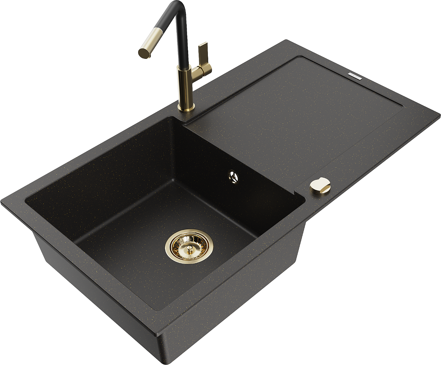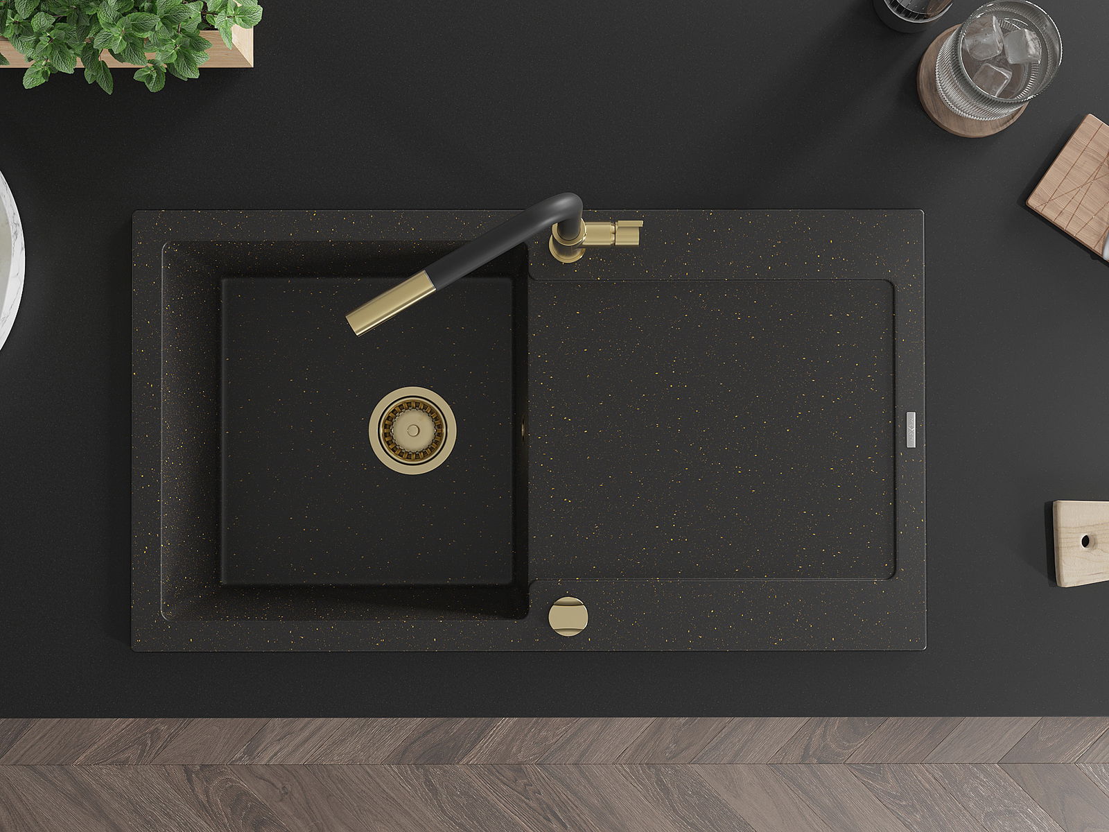 Mexen Leo chiuvetă de bucătărie din granit cu 1 compartiment cu scurgător și baterie de bucătărie Flora, negru/auriu metalic - ?