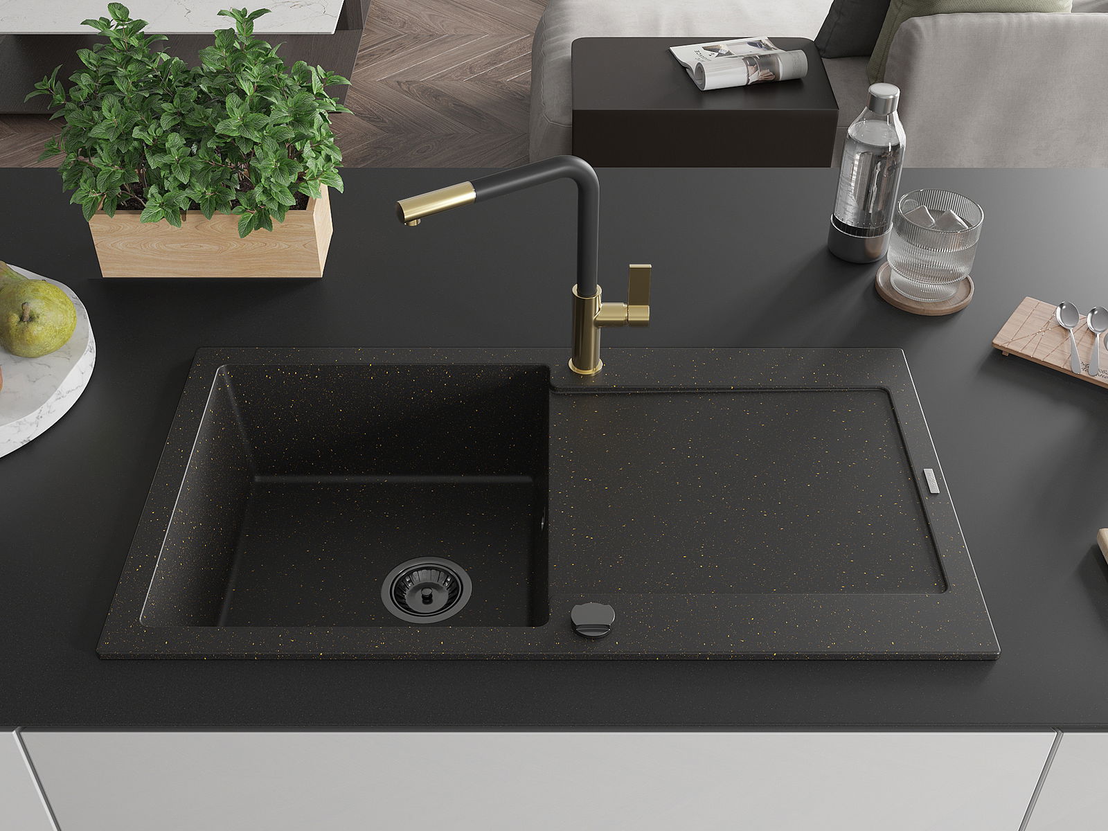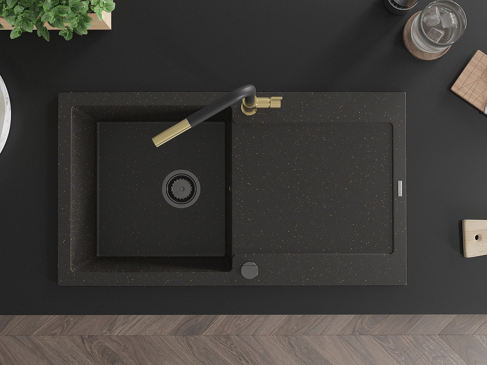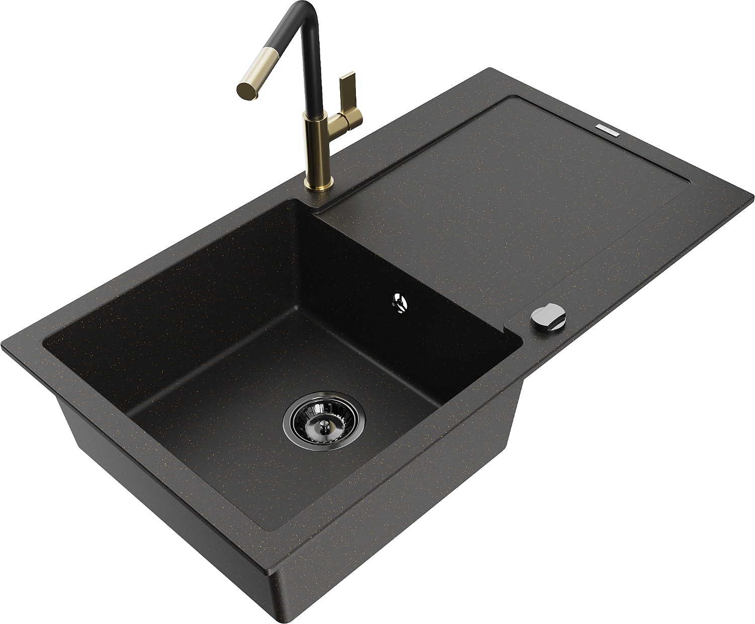 Mexen Leo chiuvetă din granit cu 1 compartiment cu scurgător și baterie de bucătărie Flora, negru/auriu metalizat