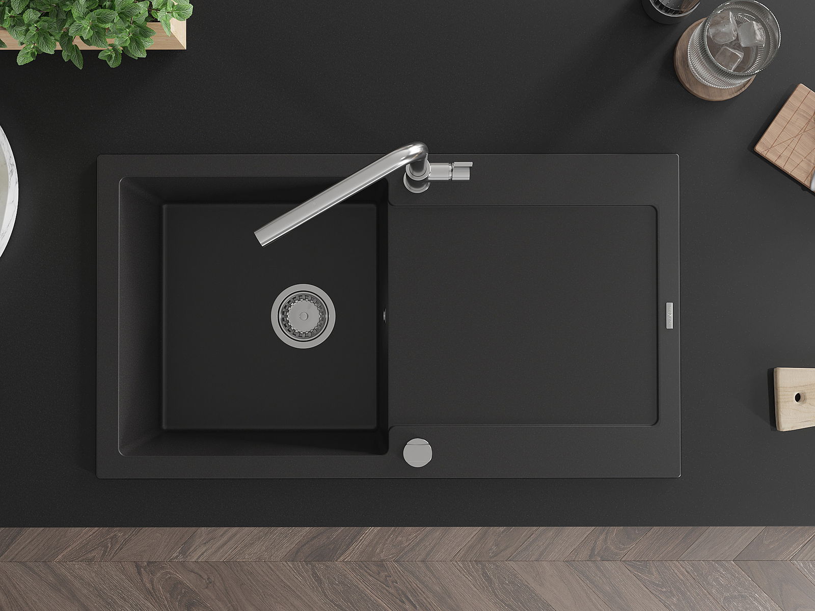 Mexen Leo chiuvetă de granit cu 1 compartiment cu scurgător și baterie de bucătărie Flora, negru - 6501-77-670401-00