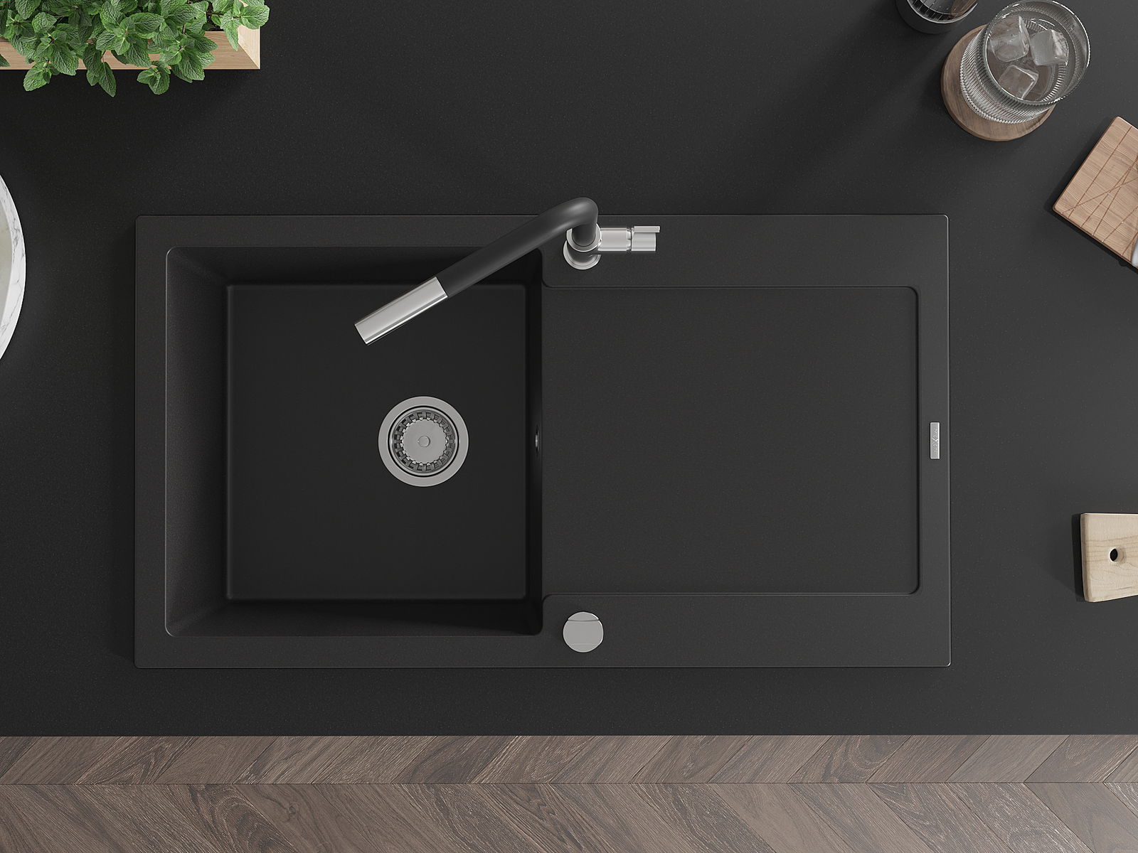 Mexen Leo chiuvetă din granit cu 1 cameră, cu scurgător și baterie de bucătărie Flora, negru - 6501-77-670401-07