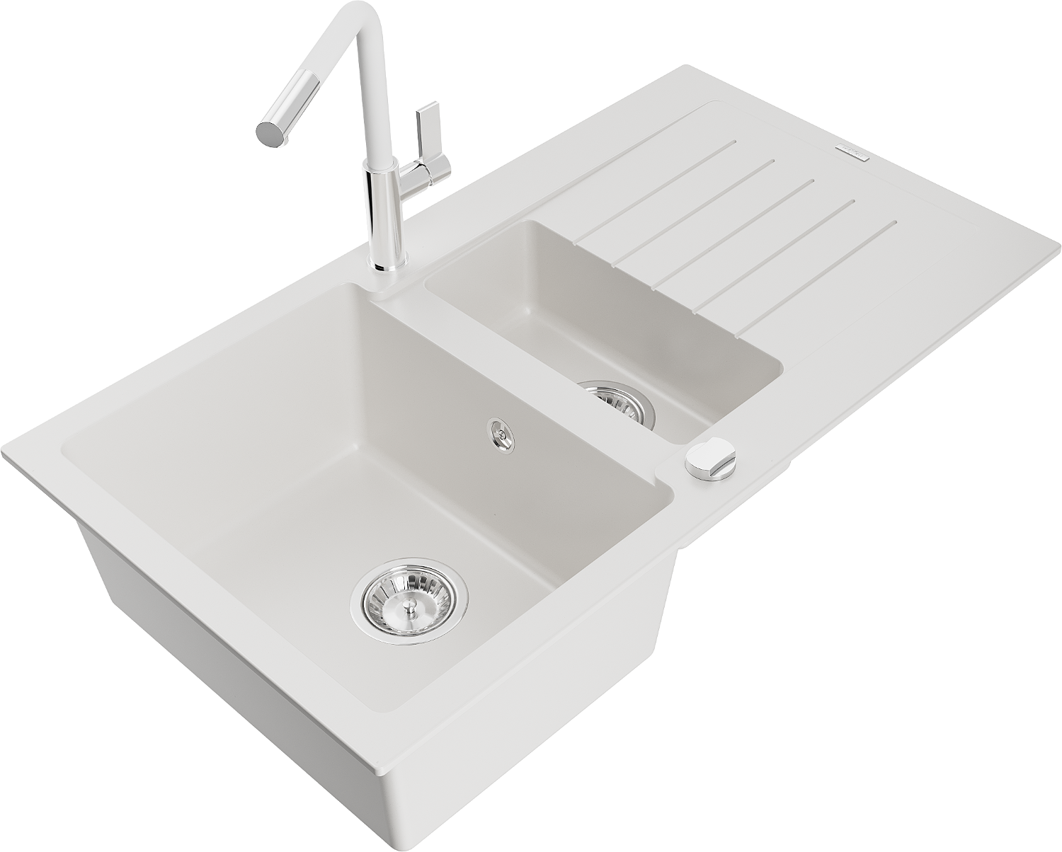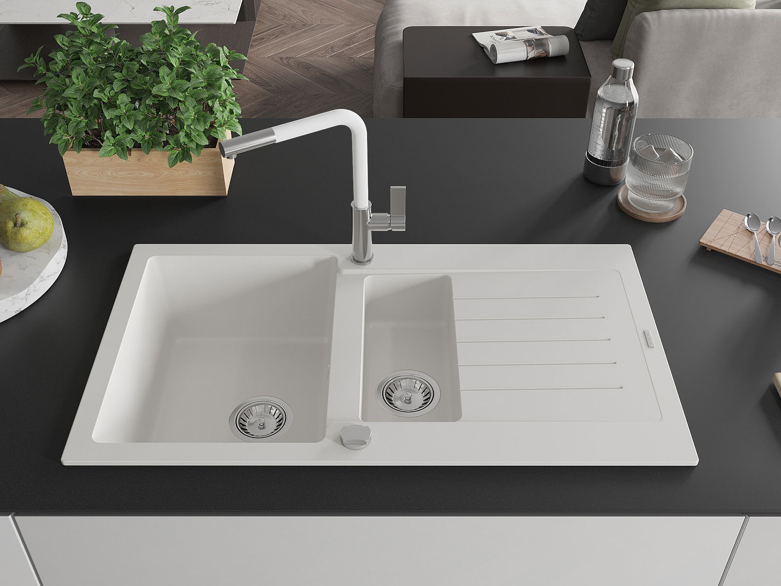 Mexen Matias chiuvetă de bucătărie din granit cu 1,5 camere, cu scurgător și baterie Flora, alb - 6502-20-670401-02