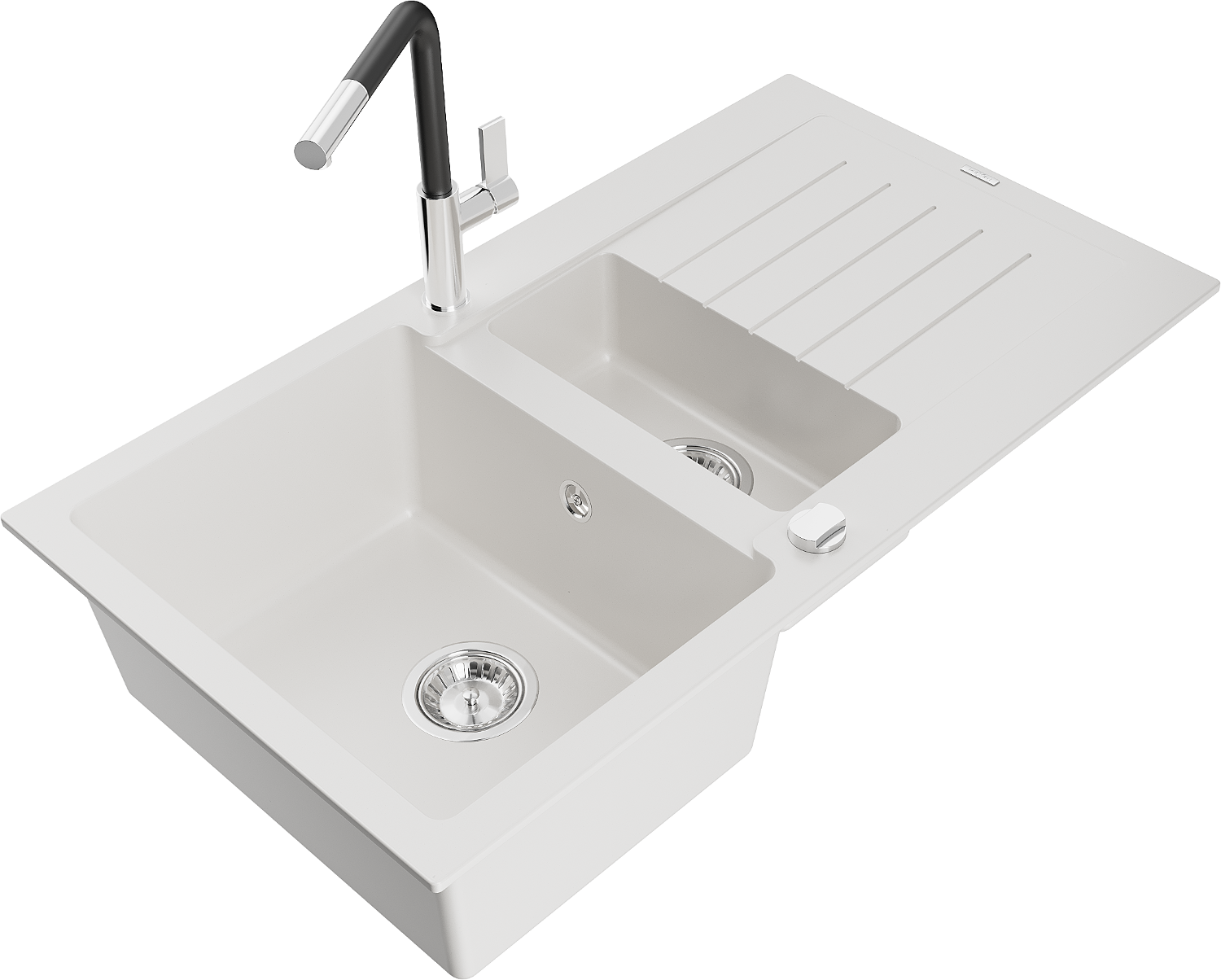 Mexen Matias chiuvetă de granit 1,5 camere cu scurgător și baterie de bucătărie Flora, alb - 6502-20-670401-07