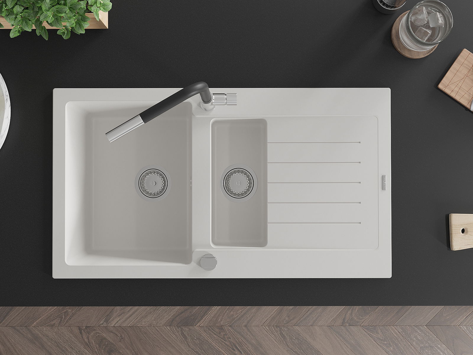 Datorită sistemului de montare universală, chiuveta este reversibilă, iar scurgerea poate fi montată pe blat la stânga sau la dreapta. În acest fel, puteți ajusta cu ușurință pagina la nevoile și condițiile dvs.