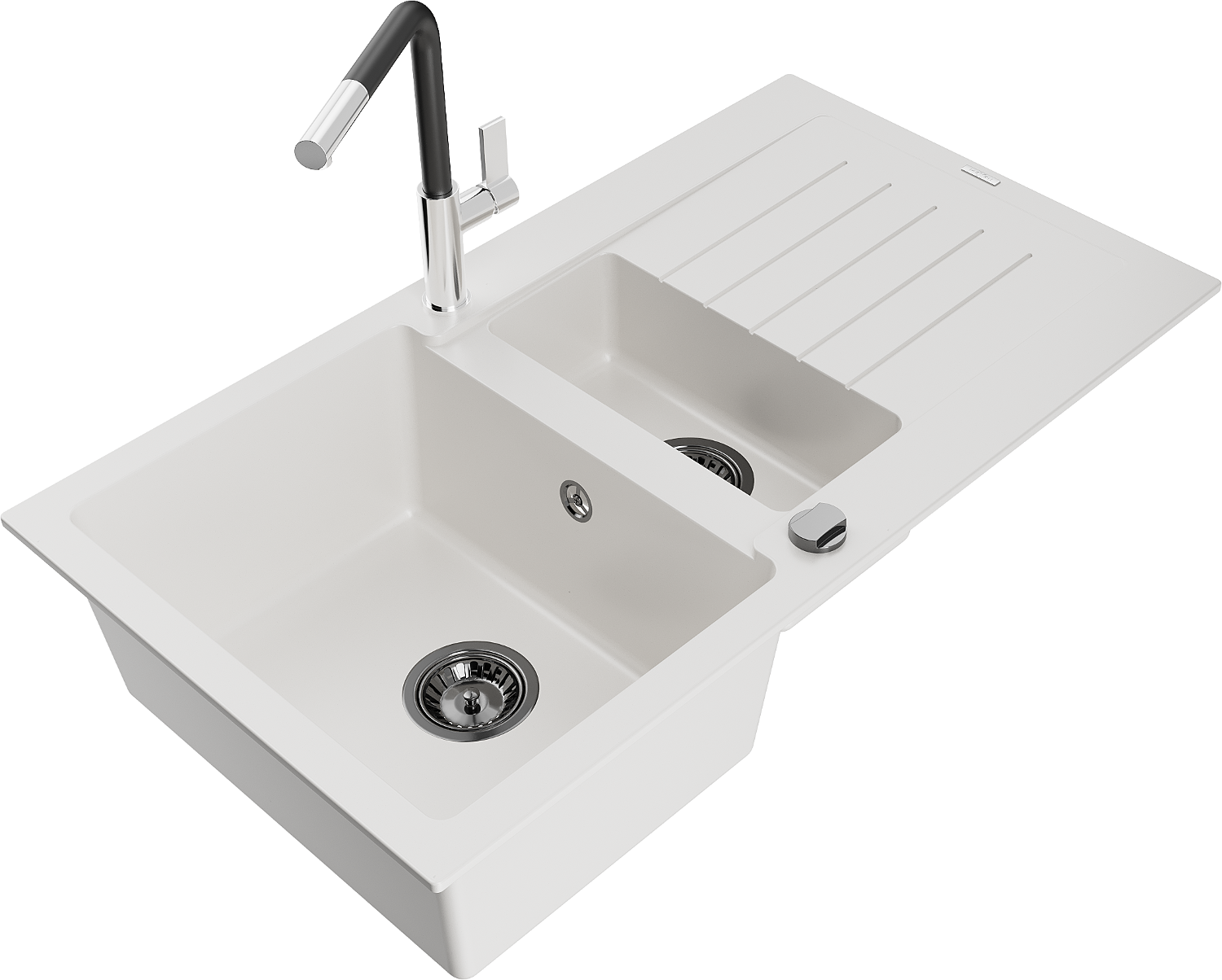 Mexen Matias chiuvetă granit 1,5 camere cu scurgător și baterie de bucătărie Flora, alb - 6502-20-670401-07-B