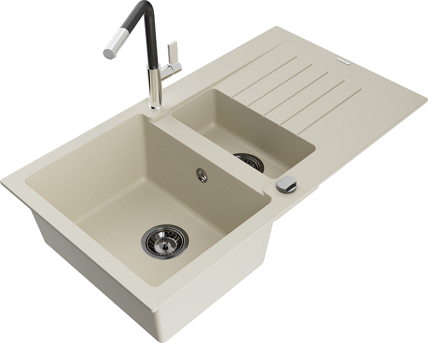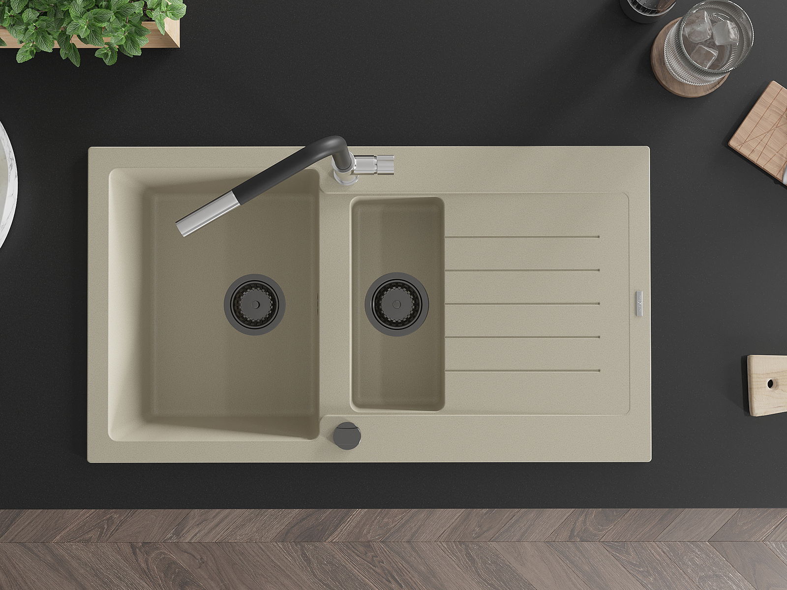 Mexen Matias chiuvetă din granit cu 1,5 compartimente și scurgător și baterie de bucătărie Flora, bej - 6502-69-670401-07-B