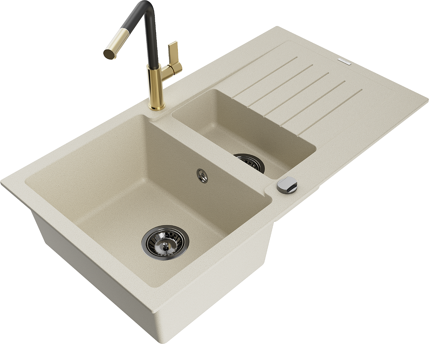 Mexen Matias chiuvetă de bucătărie din granit cu 1,5 compartimente cu scurgător și baterie Flora, bej - 6502-69-670401-57-B
