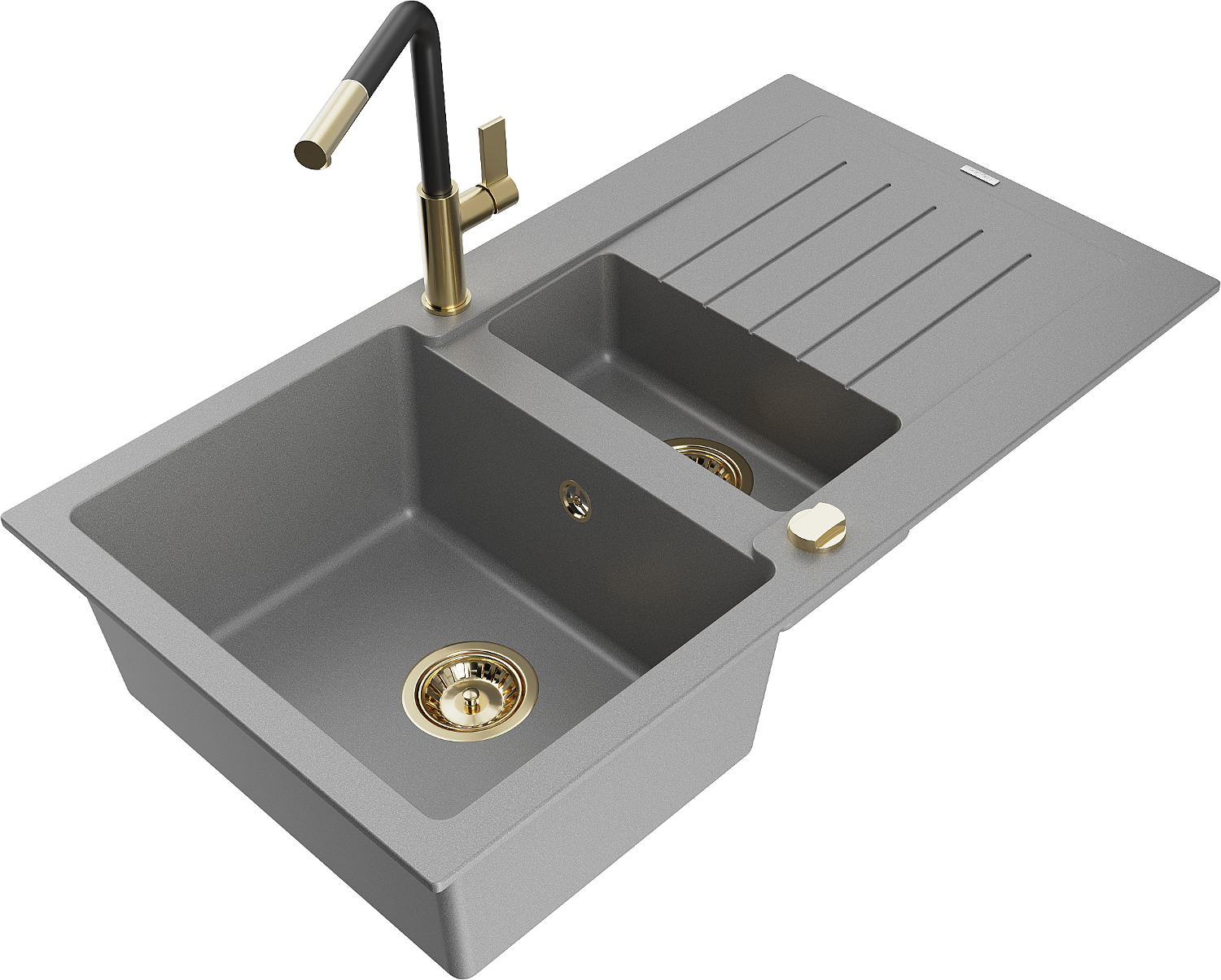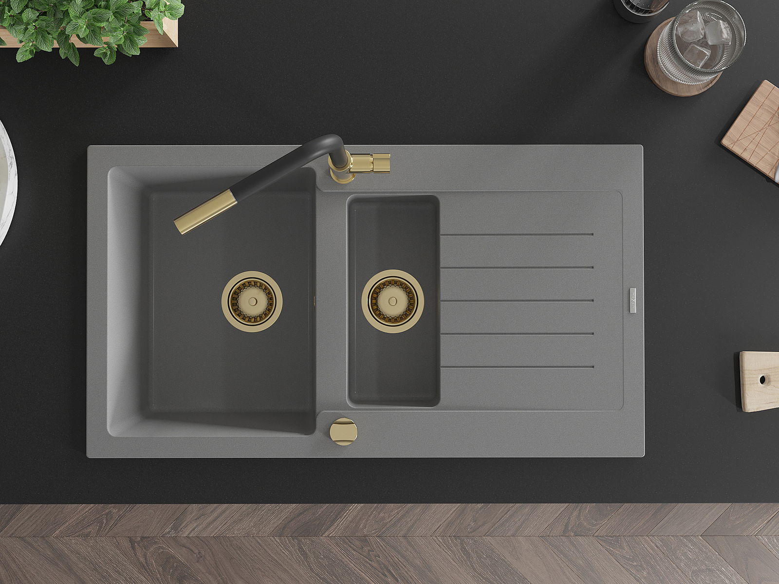 Mexen Matias chiuvetă de granit cu 1,5 compartimente cu picurător și baterie pentru bucătărie Flora, gri - 6502-71-670401-57-G