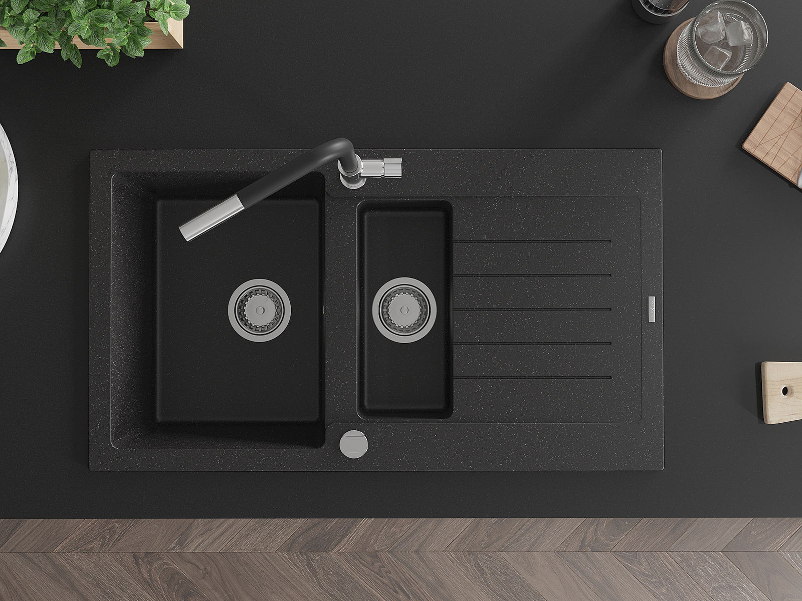 Mexen Matias chiuvetă de bucătărie din granit cu 1.5 cuve, cu scurgător și baterie Flora, negru/argintiu - 6502-73-670401-07