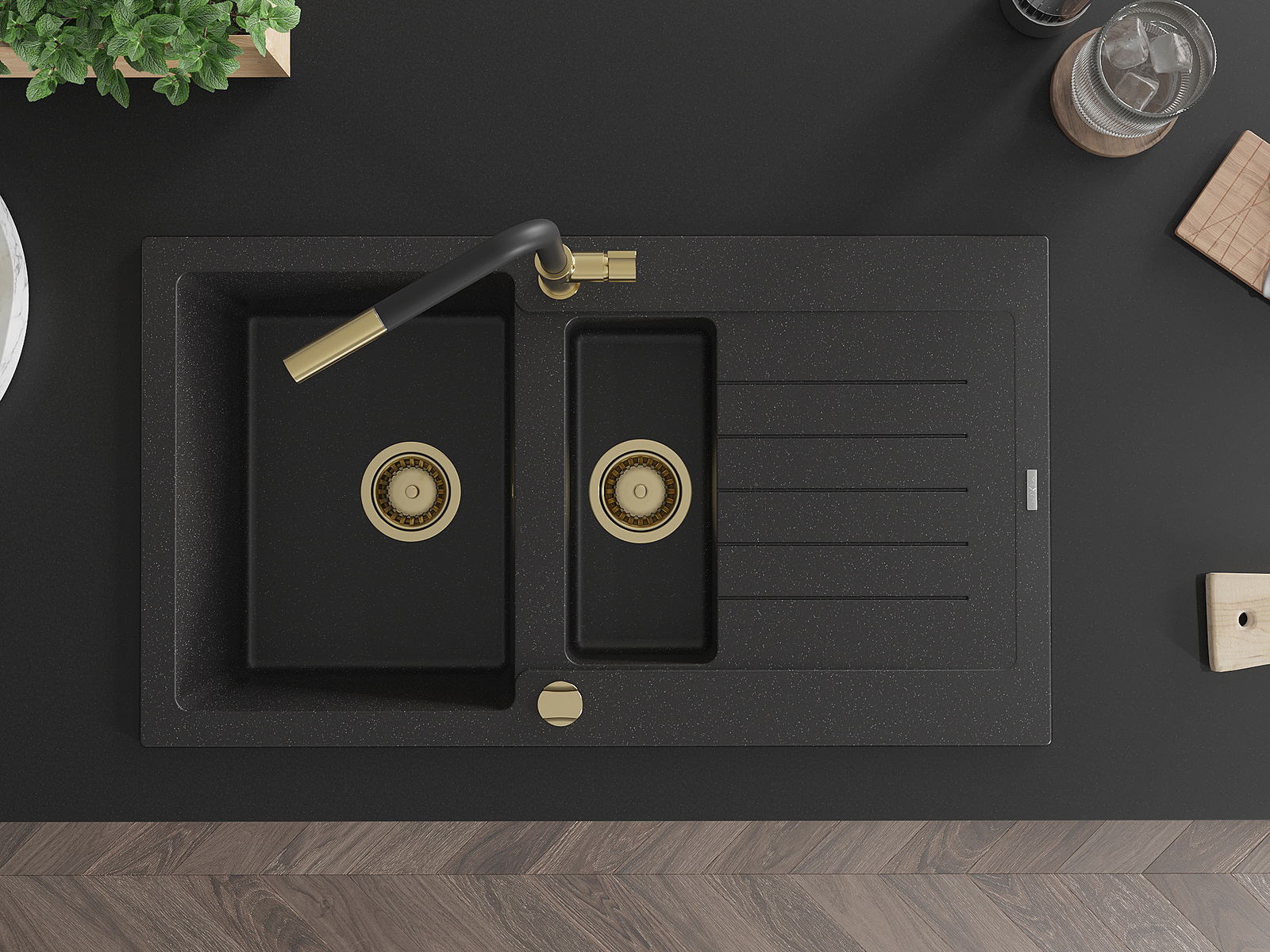 Chiuveta are 2 orificii frezate de 35 mm în diametru, care pot fi perforate manual. Acestea pot fi utilizate, printre altele, pentru instalarea unui dozator de detergent, care va elimina prezența sticlelor de plastic din bucătărie și va oferi un finisaj elegant.