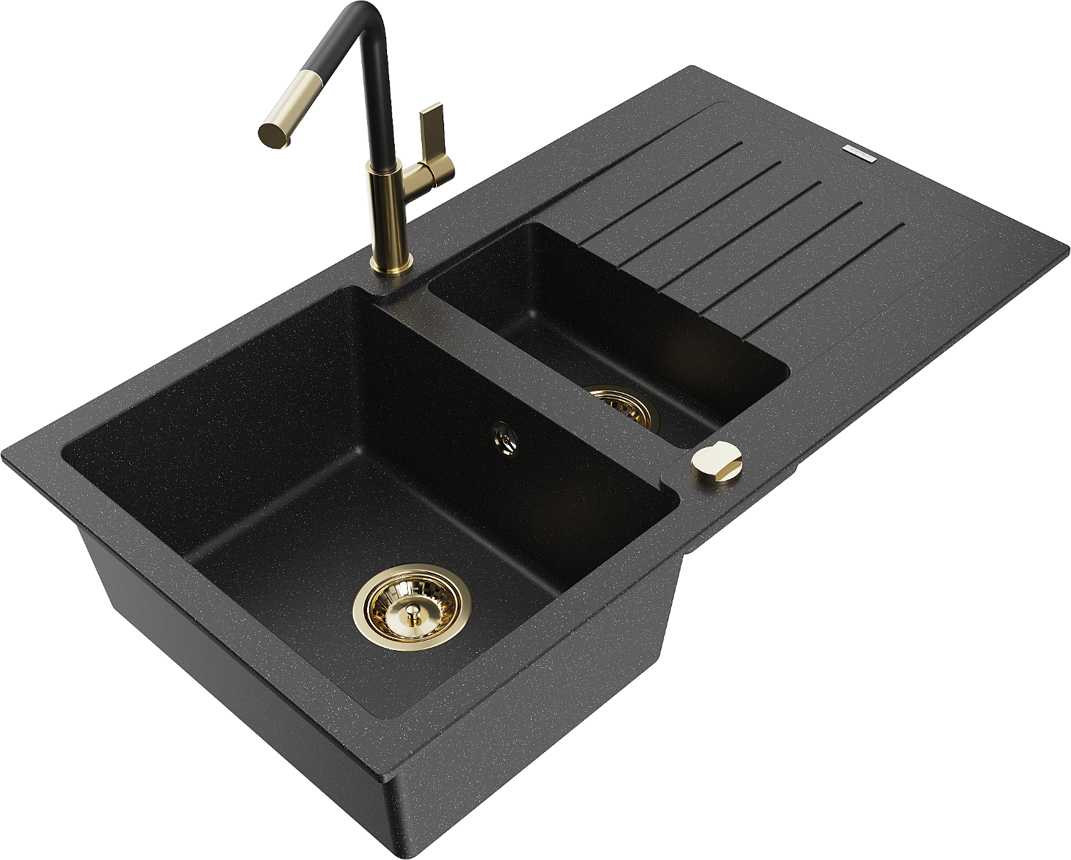 Mexen Matias chiuvetă de granit cu 1,5 cuve cu scurgător și baterie de bucătărie Flora, negru/argintiu