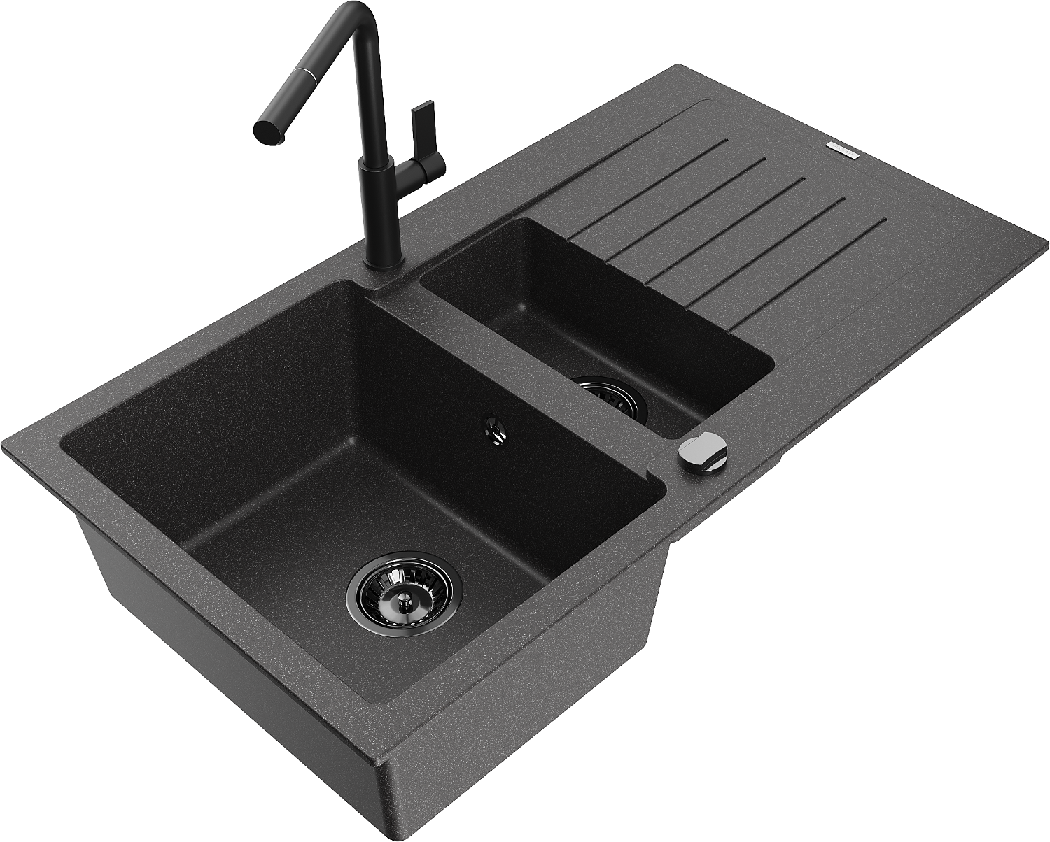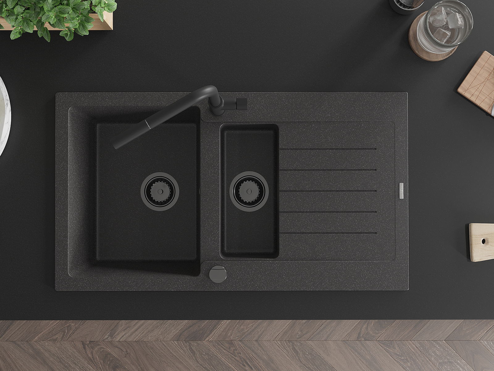 Mexen Matias chiuvetă din granit 1,5 camere cu scurgător și baterie de bucătărie Flora, negru pătat - 6502-76-670401-70-B